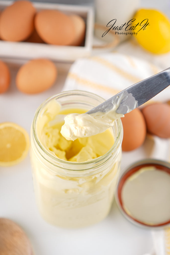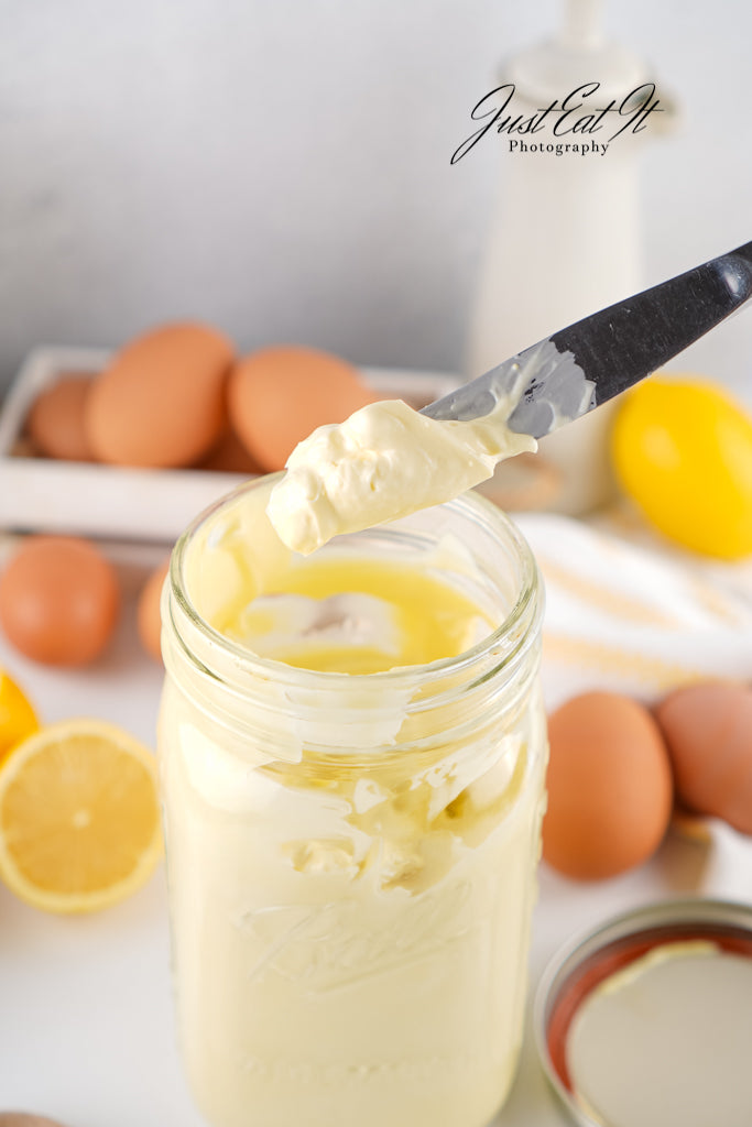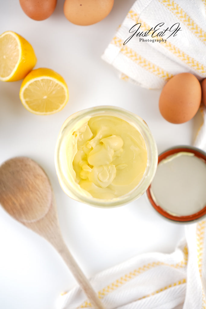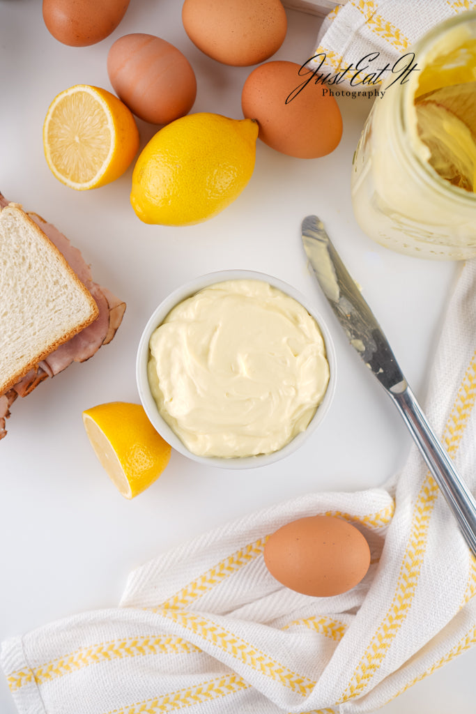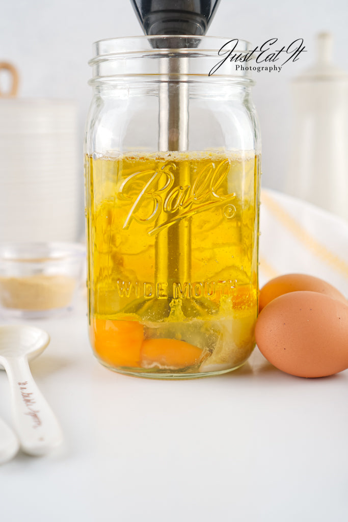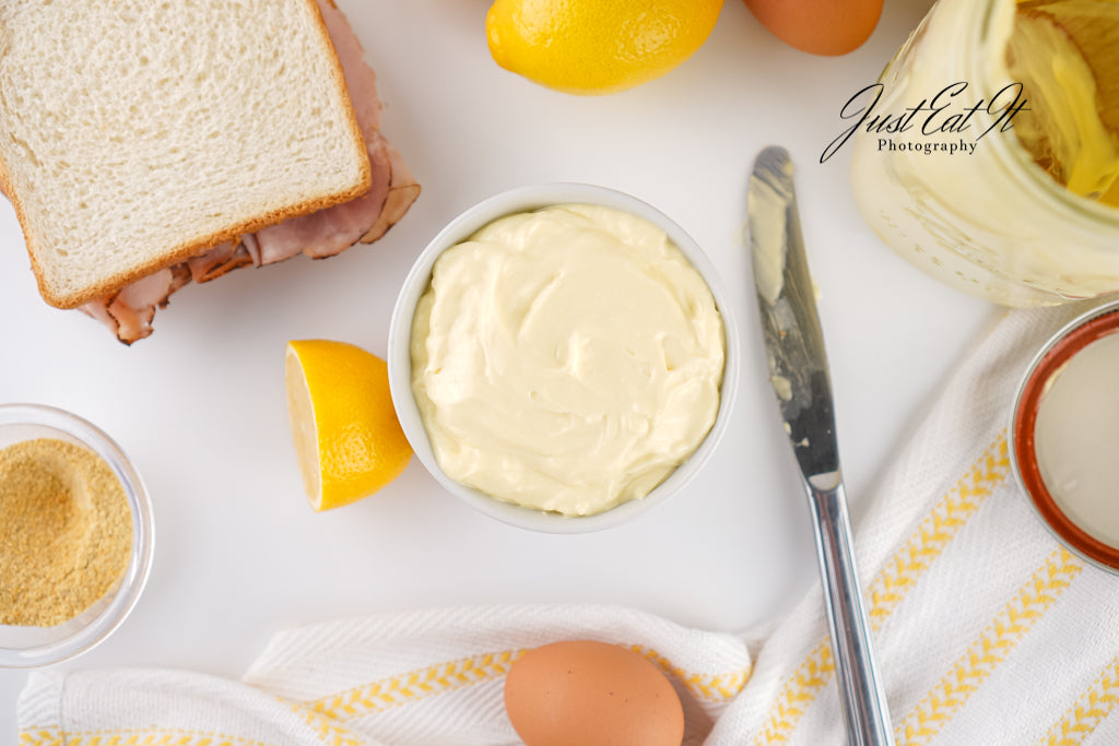 - Ingredients: eggs, olive oil (or avocado oil), ground mustard, lemon juice, vinegar, and salt.