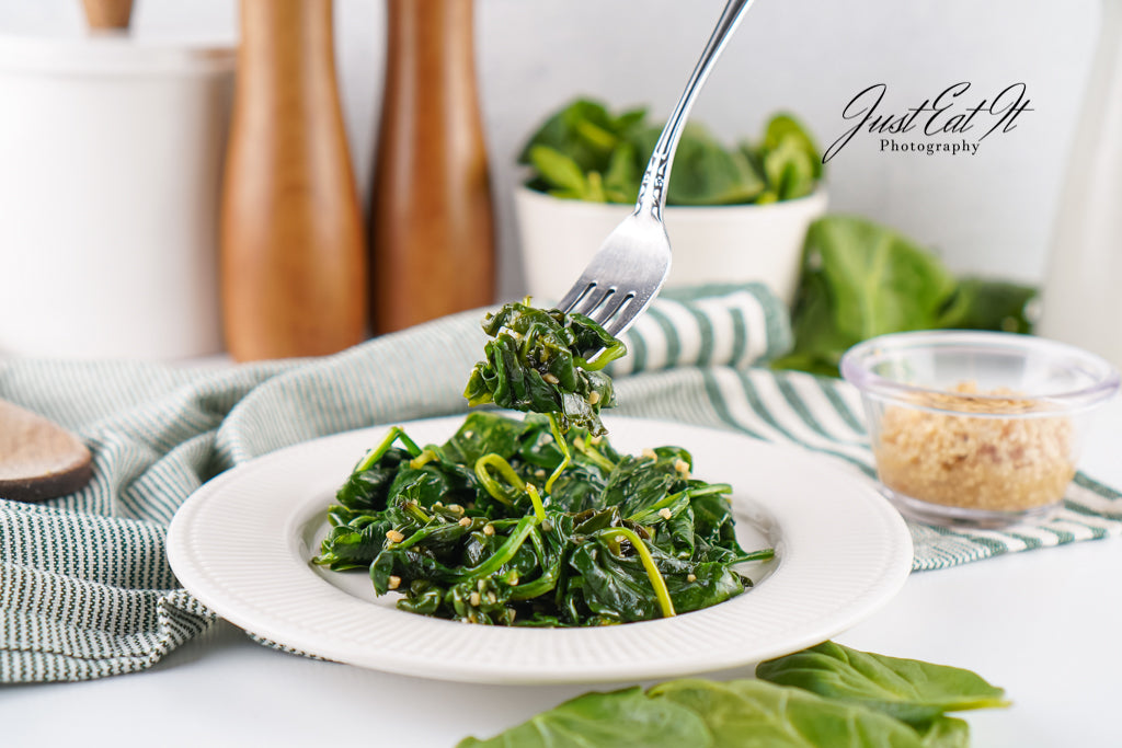 - Ingredients: fresh spinach, salt, pepper, garlic, and olive oil.