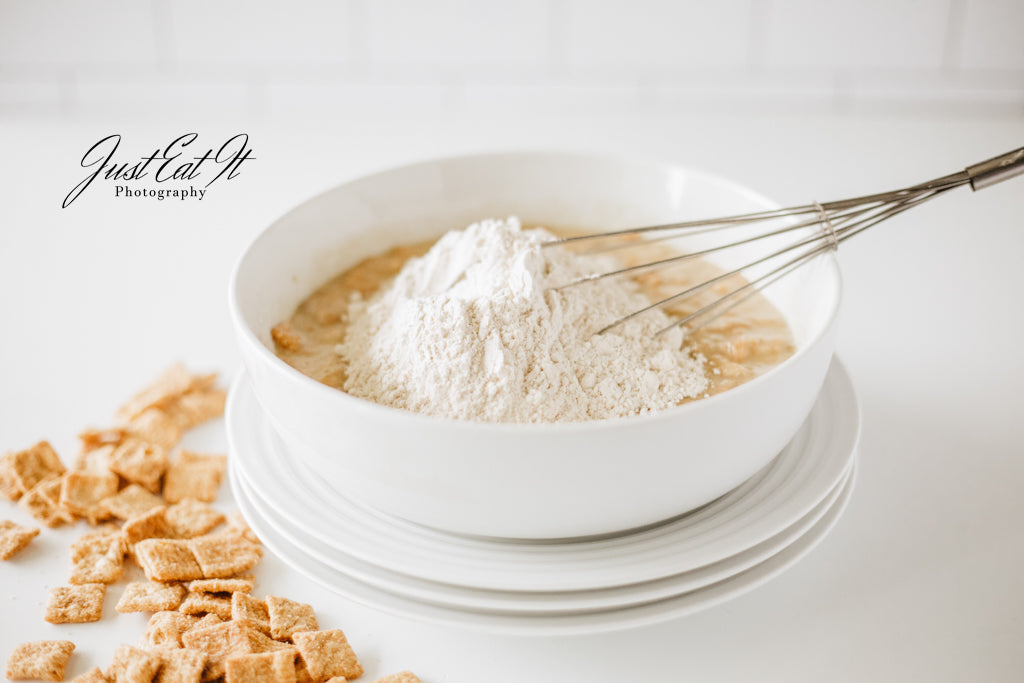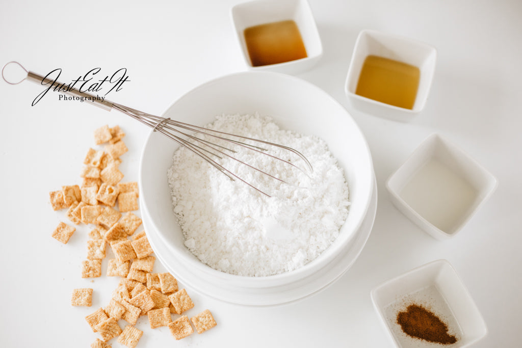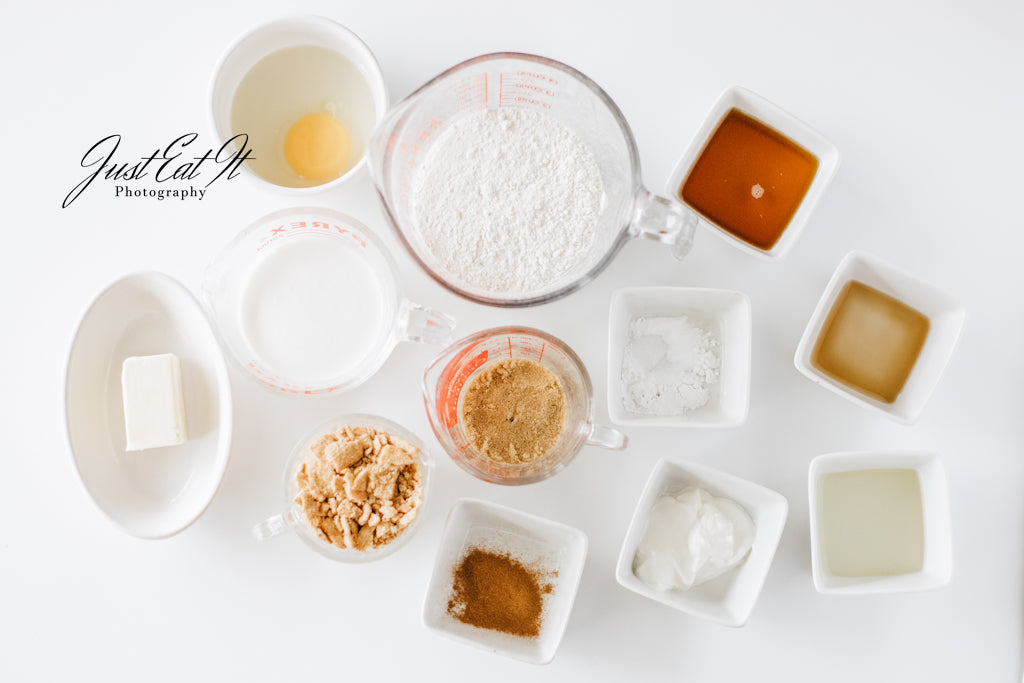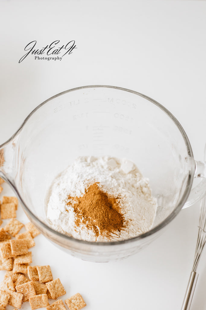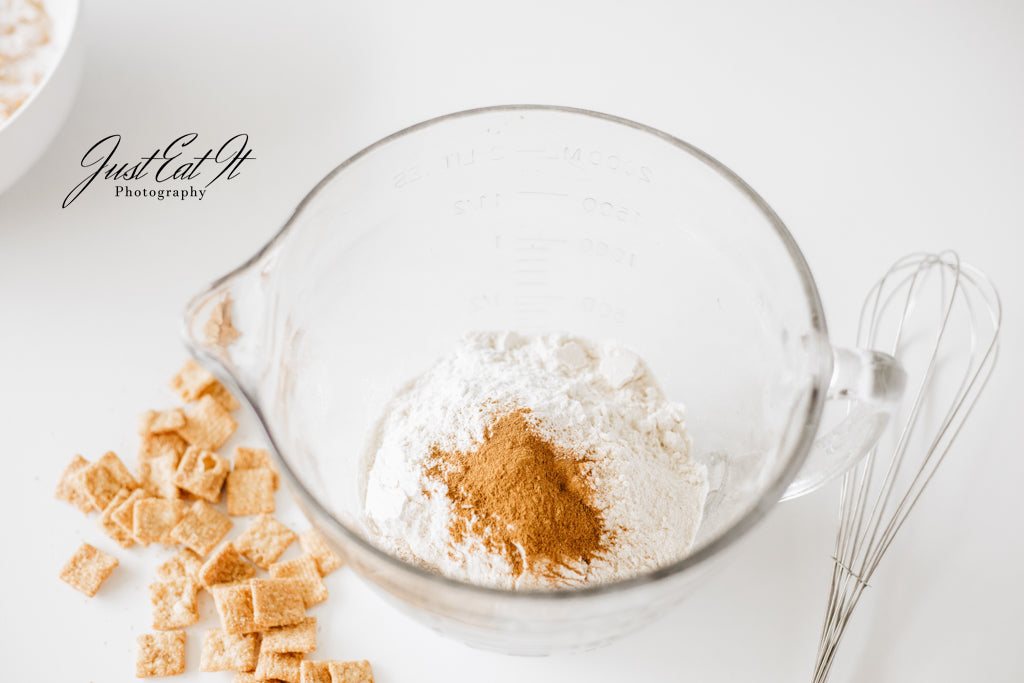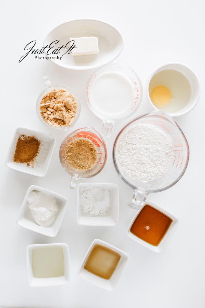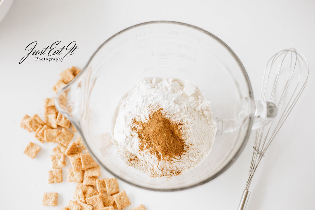 - Ingredients include cinnamon toast crunch, buttermilk, flour, baking powder, baking soda, butter, syrup, brown sugar, egg, yogurt (or sour cream), oil, vanilla, cinnamon, powdered sugar, and milk.