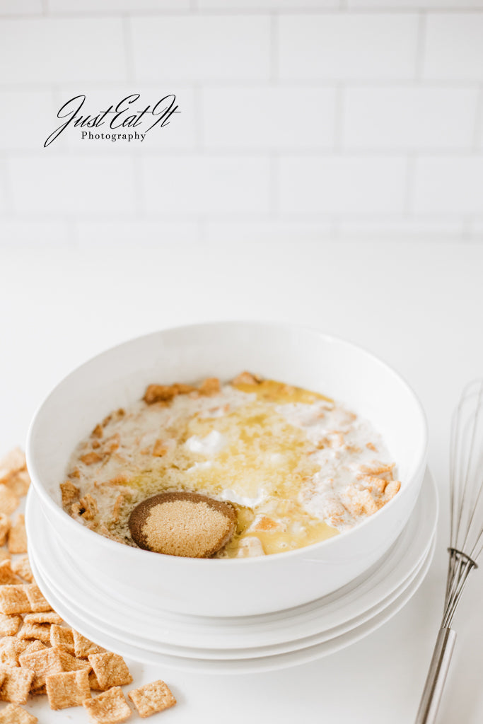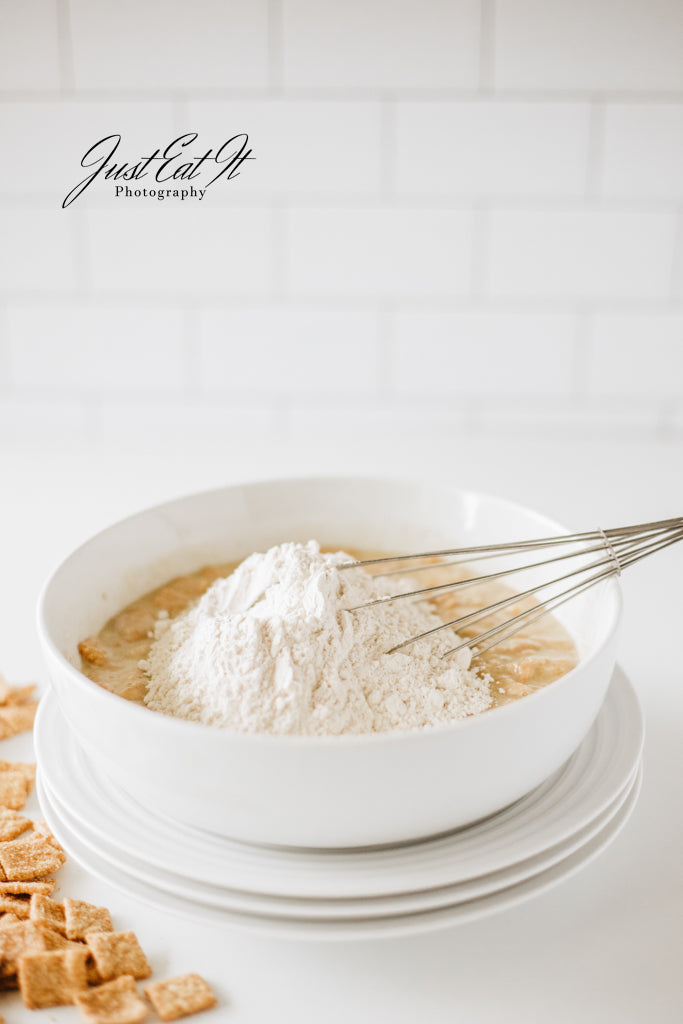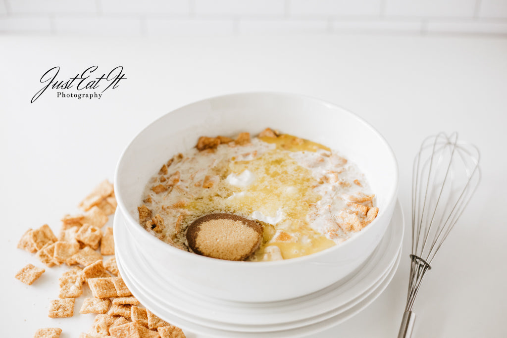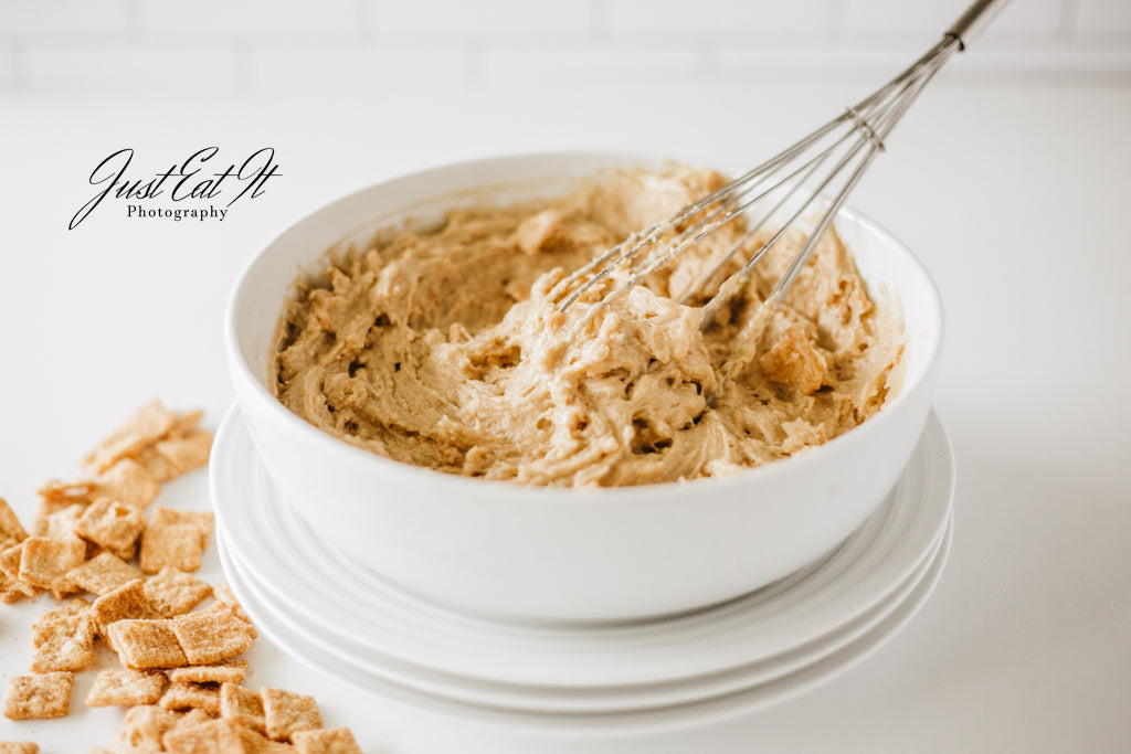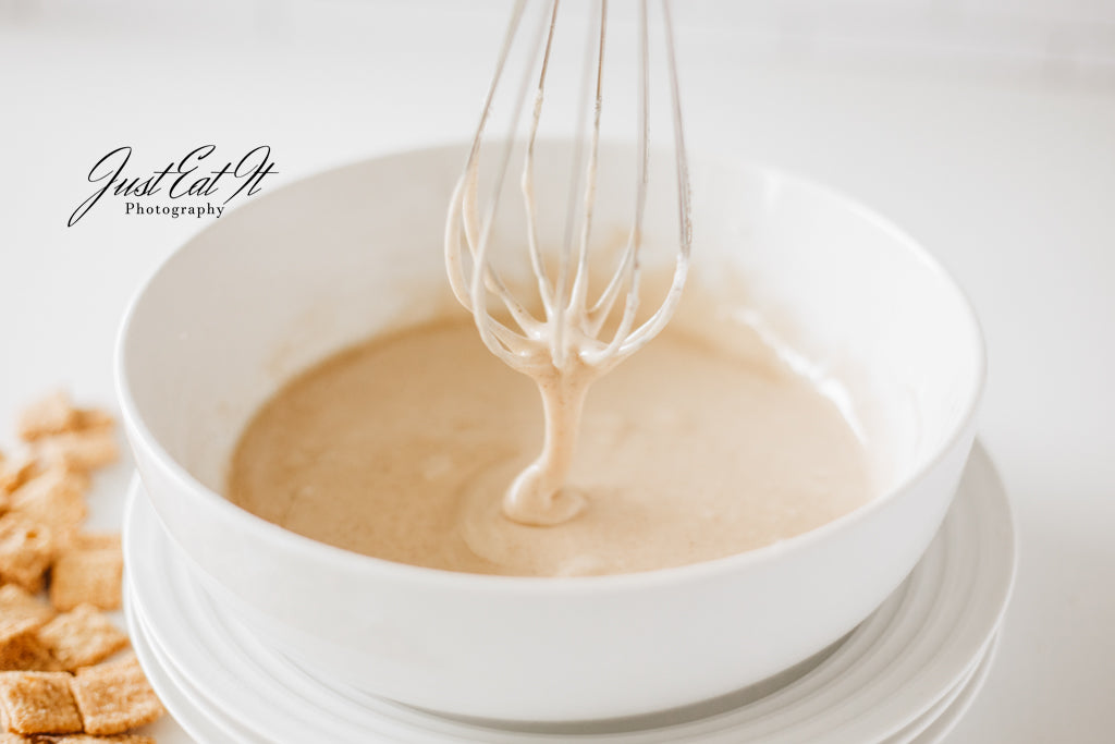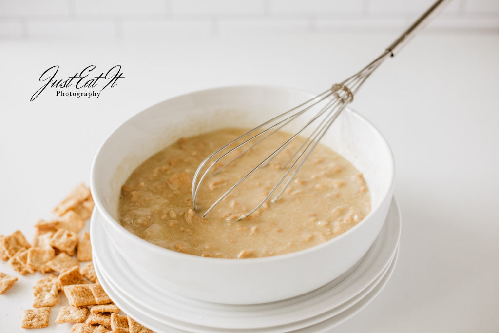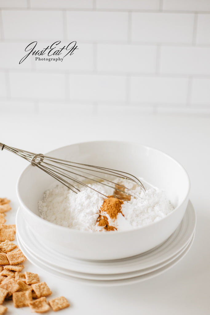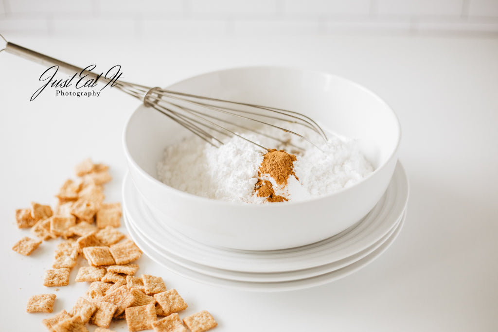 - Ingredients include cinnamon toast crunch, buttermilk, flour, baking powder, baking soda, butter, syrup, brown sugar, egg, yogurt (or sour cream), oil, vanilla, cinnamon, powdered sugar, and milk.