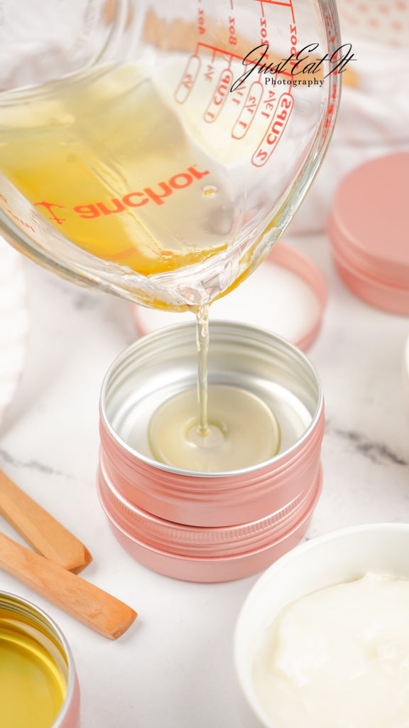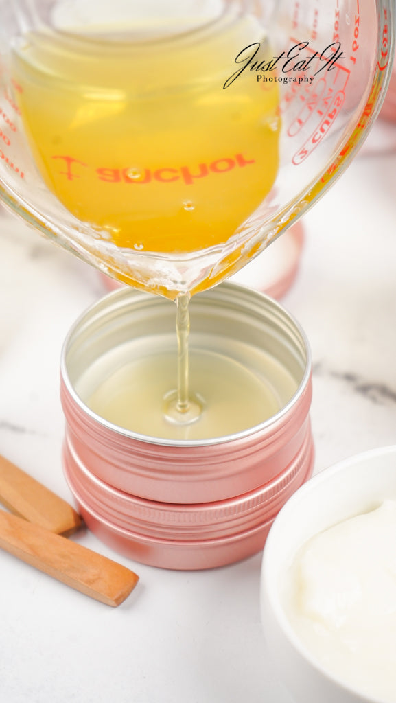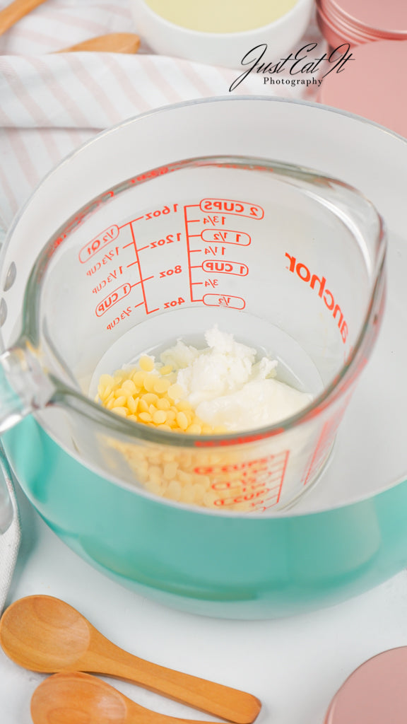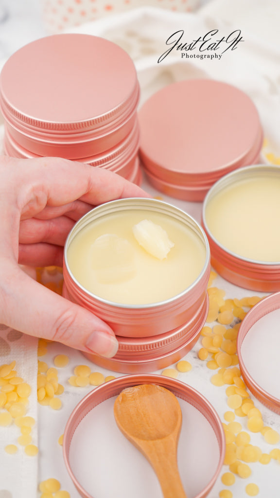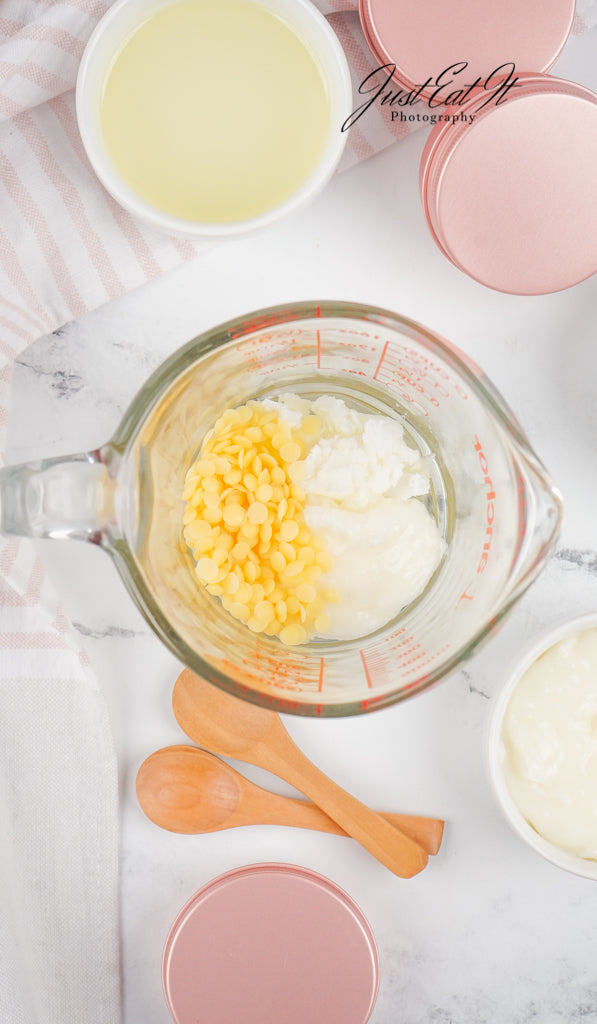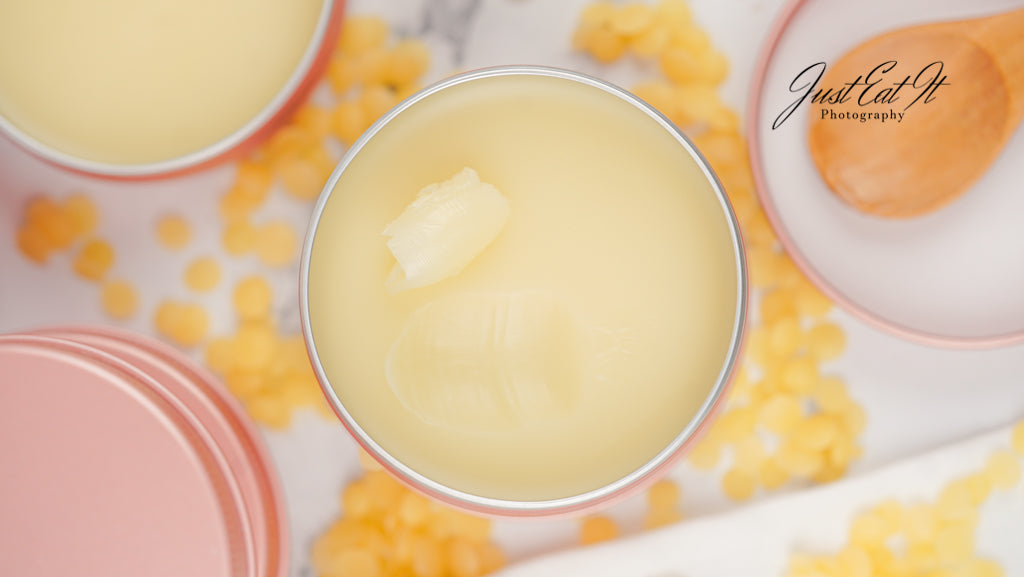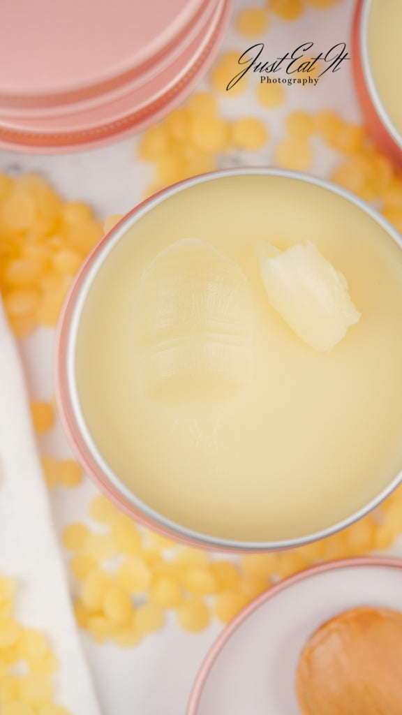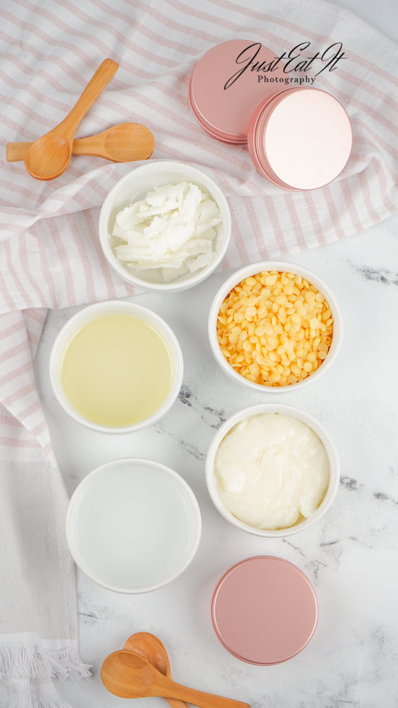 - Ingredients include water, vitamin E oil, coconut oil, beeswax, and raw shea butter.