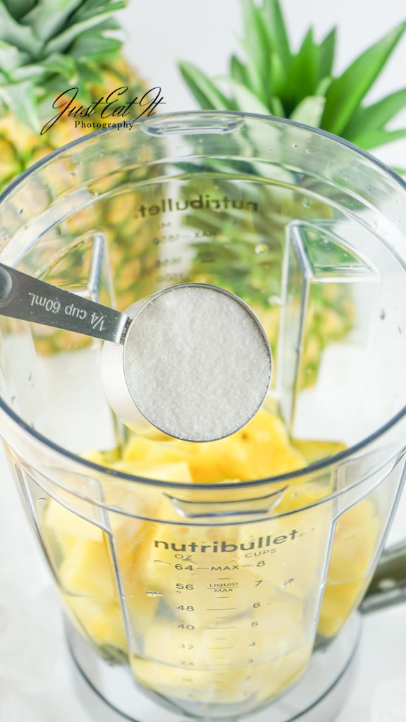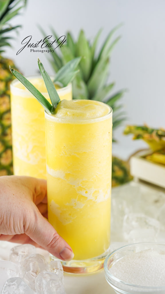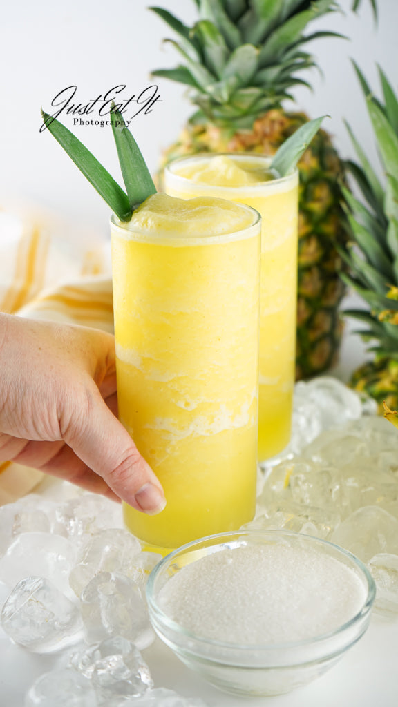 - Ingredients include pineapple, sugar, ice, and water, with chunks of pineapple or pineapple leaves as an optional garnish.