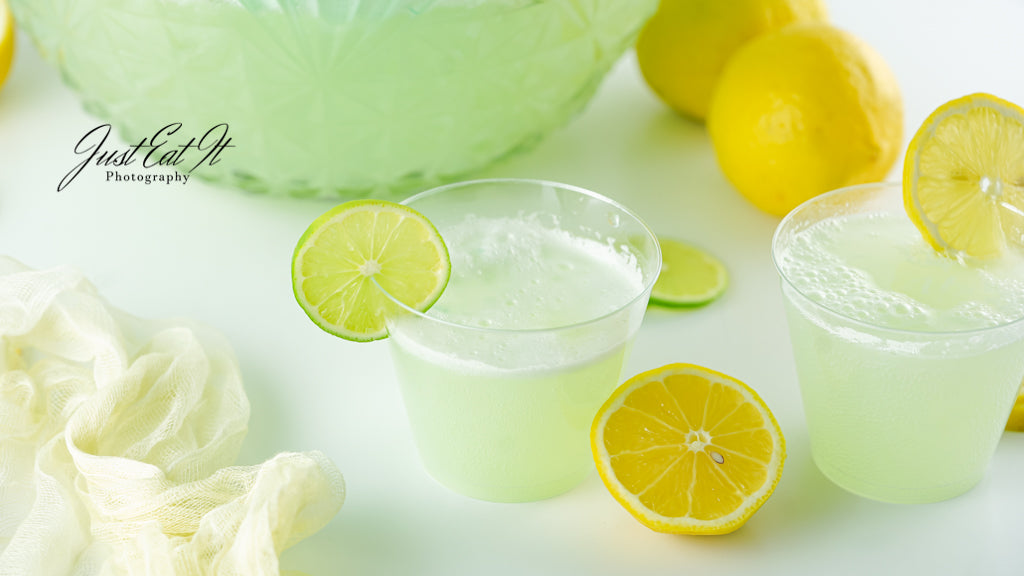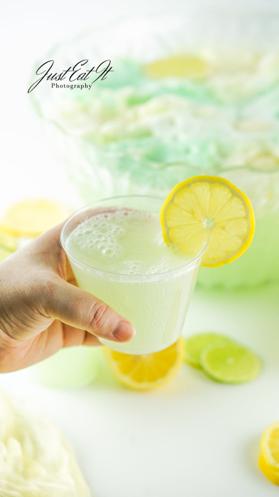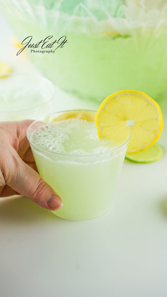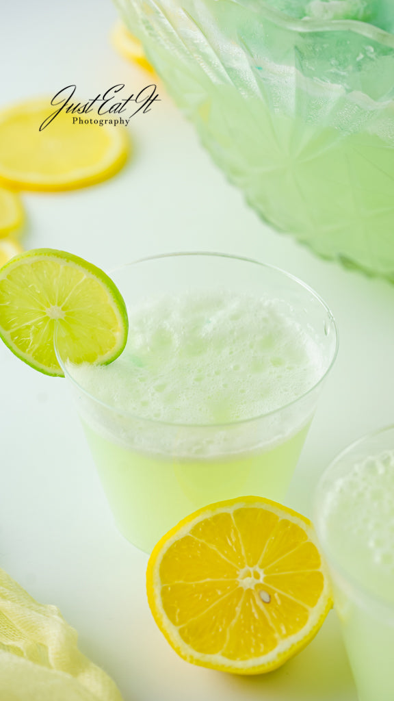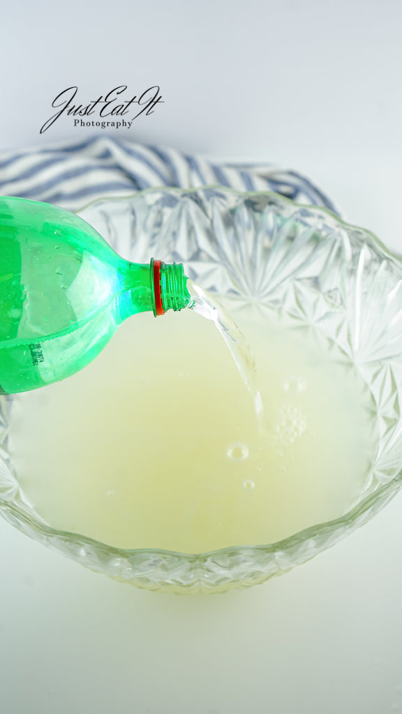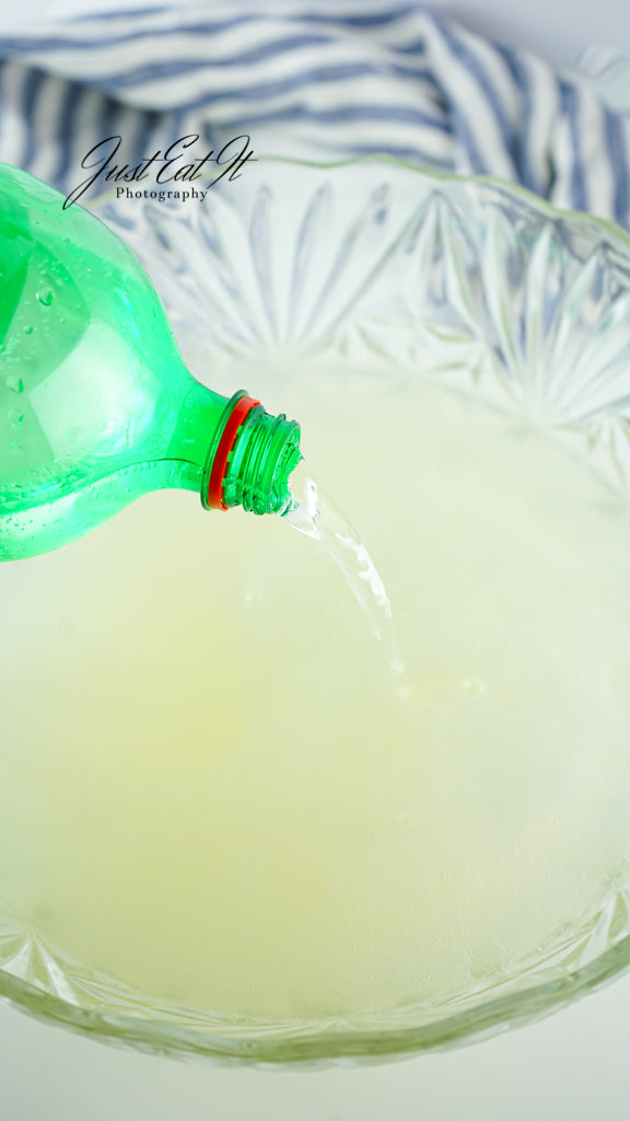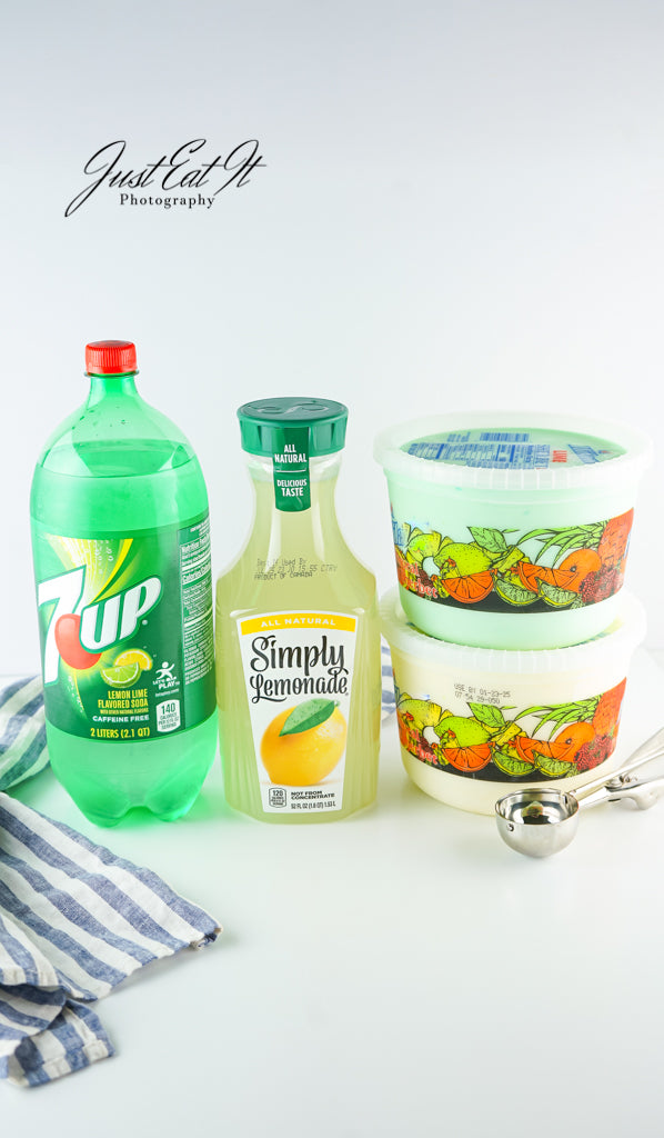 - Ingredients include 7UP, lemonade juice, and sherbet, with lemon/lime slices as an optional garnish.
