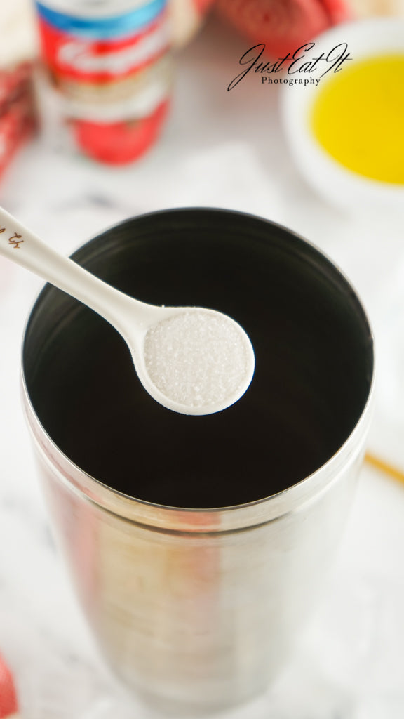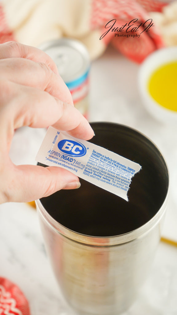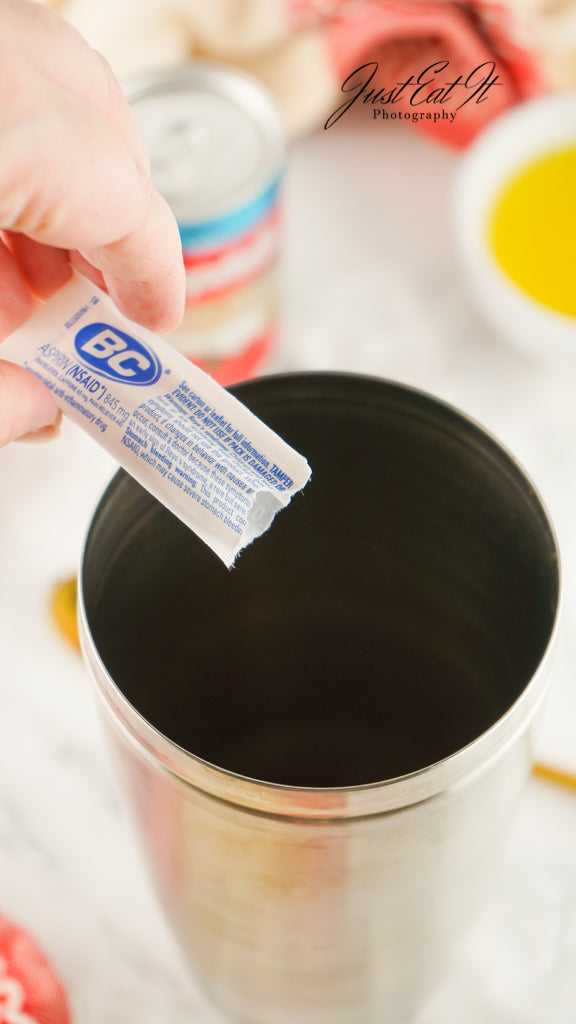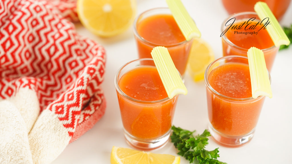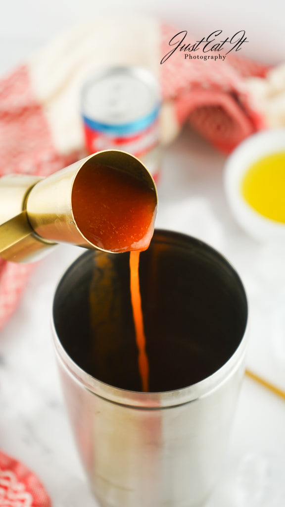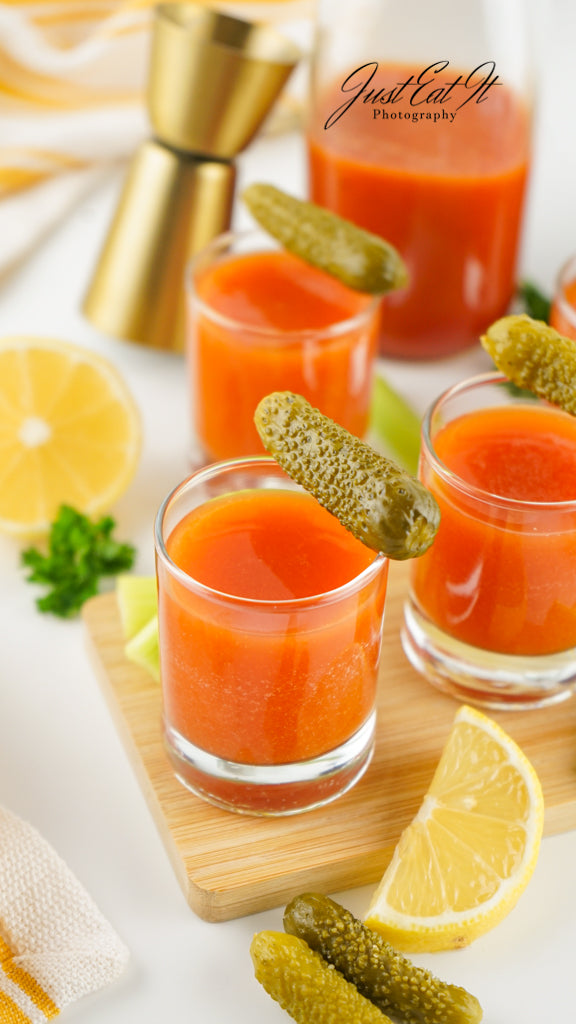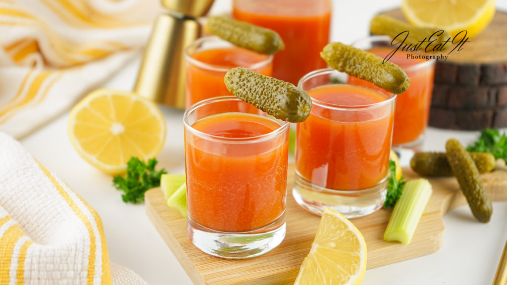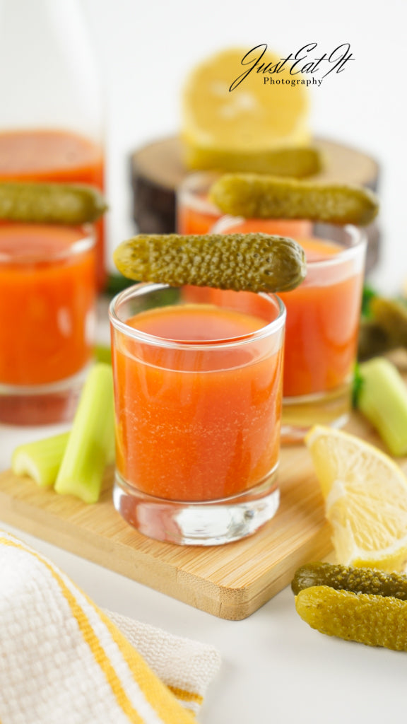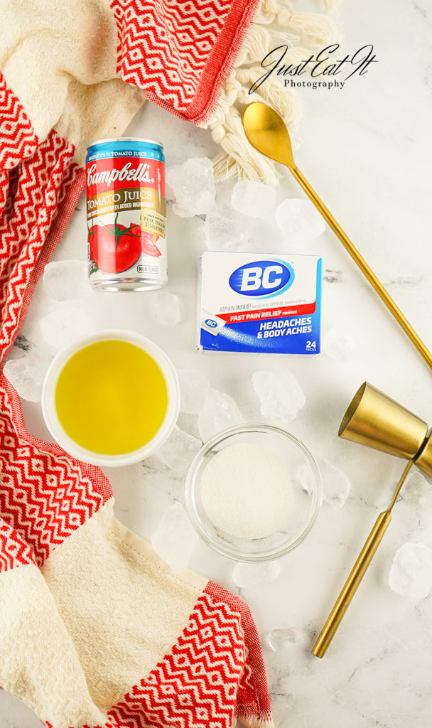 - Ingredients include tomato juice, pickle juice, sugar, and a BC pain relief powder packet, with ice being an optional item.