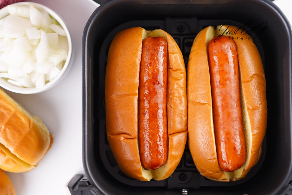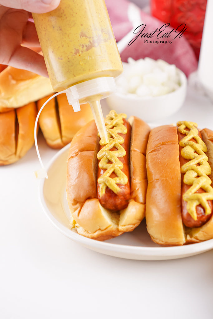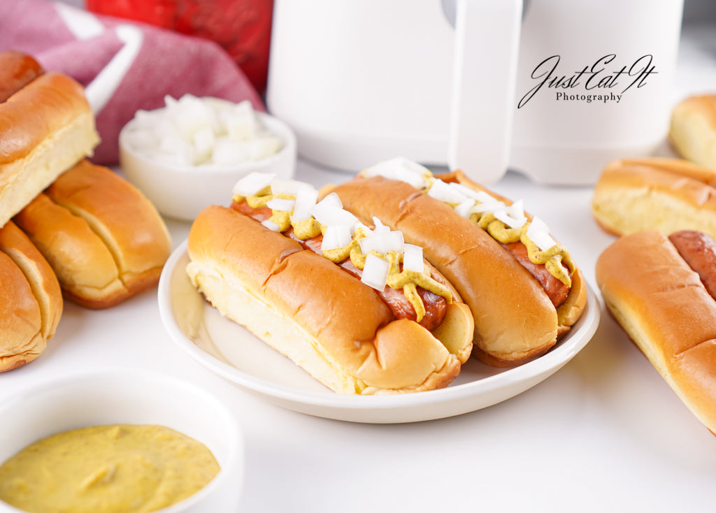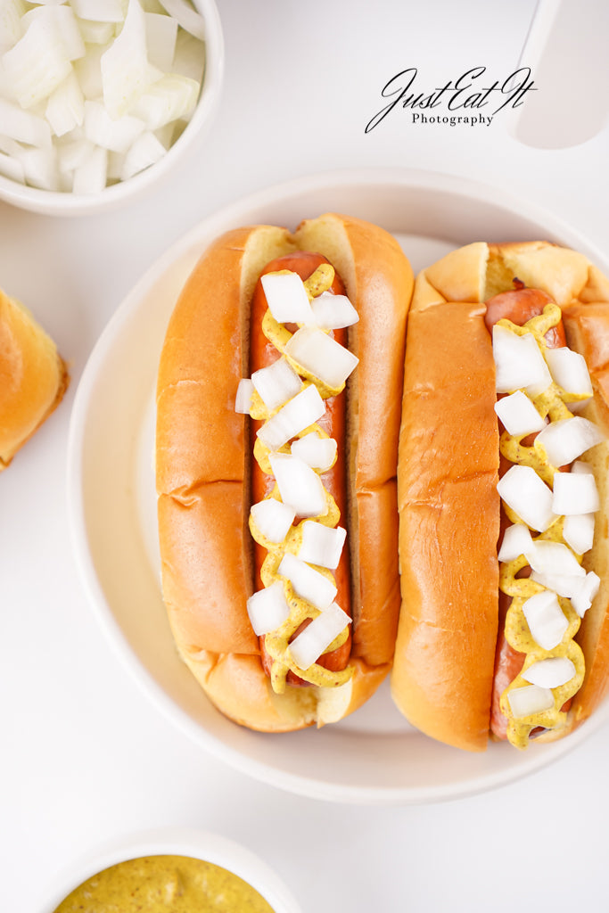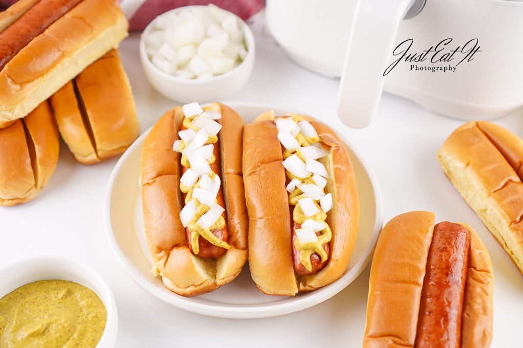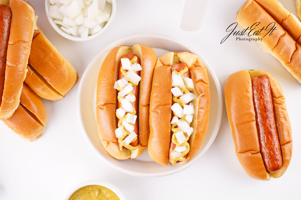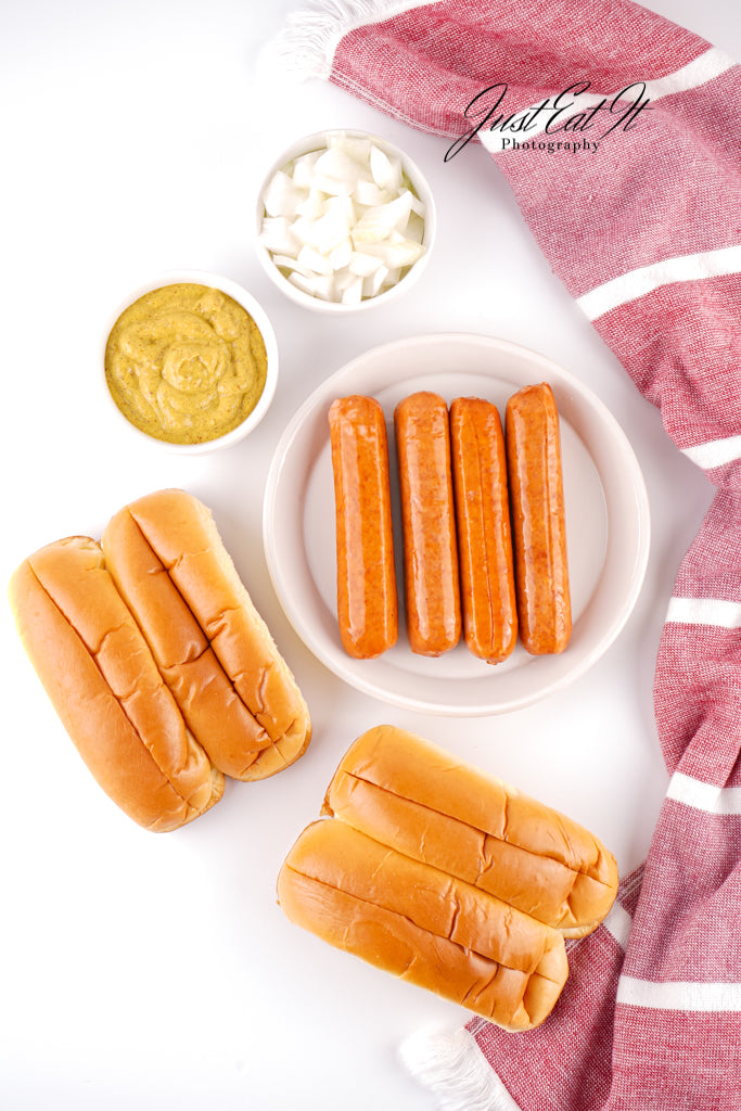 - Ingredients: smoked sausages with sausage buns, onions, and mustard as optional ingredients.