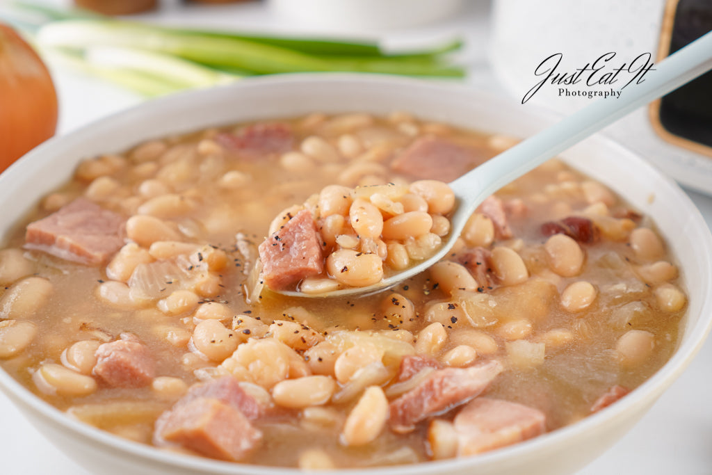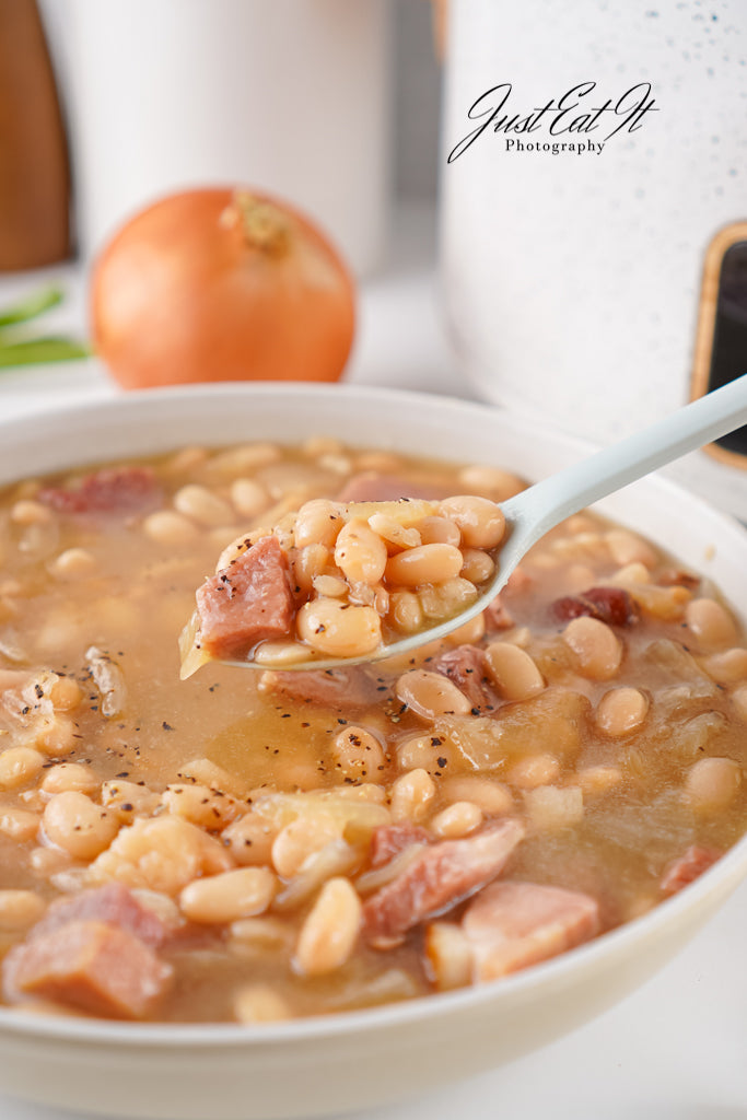 - Ingredients: dried great northern beans, chicken broth, ham, onion, salt, and garlic powder.