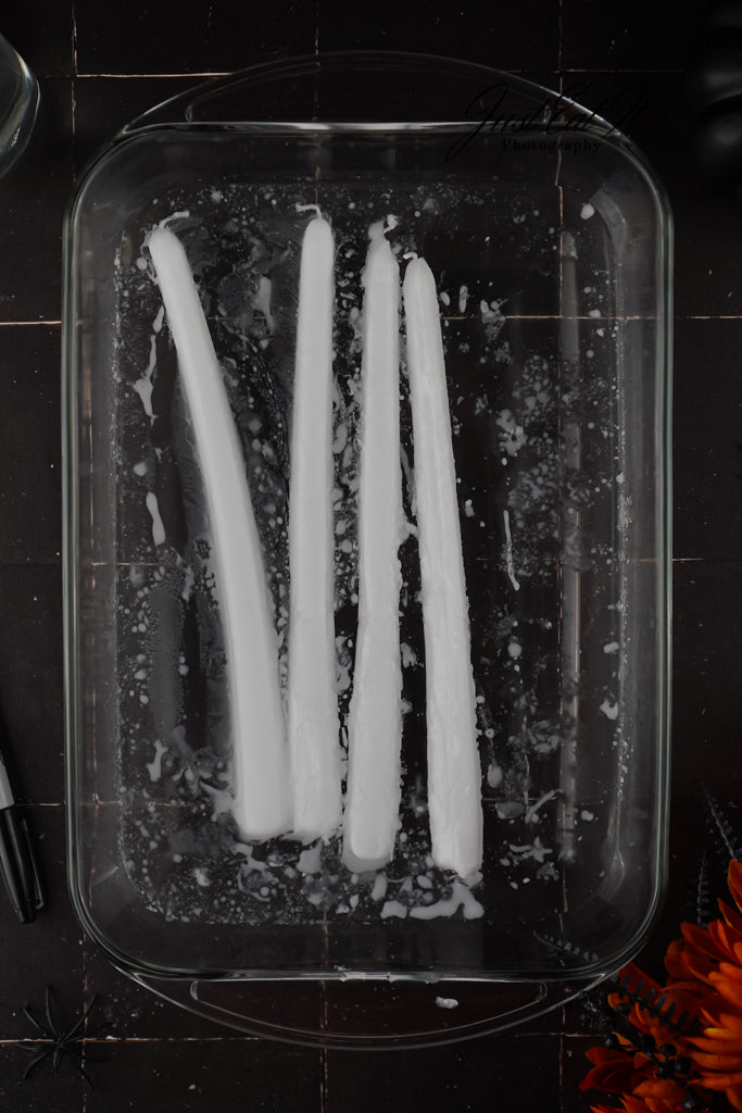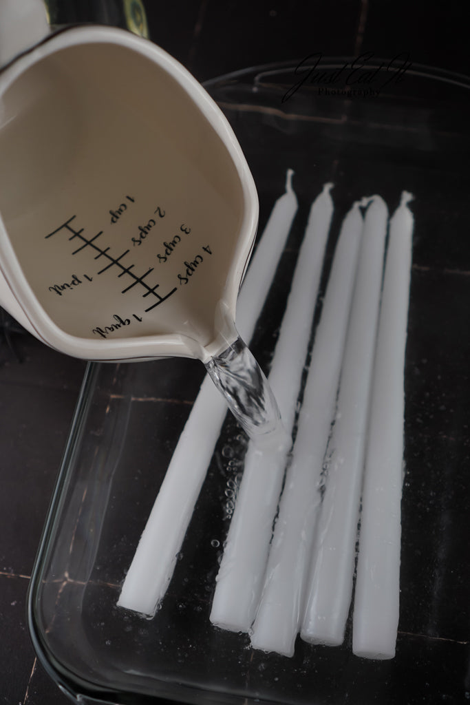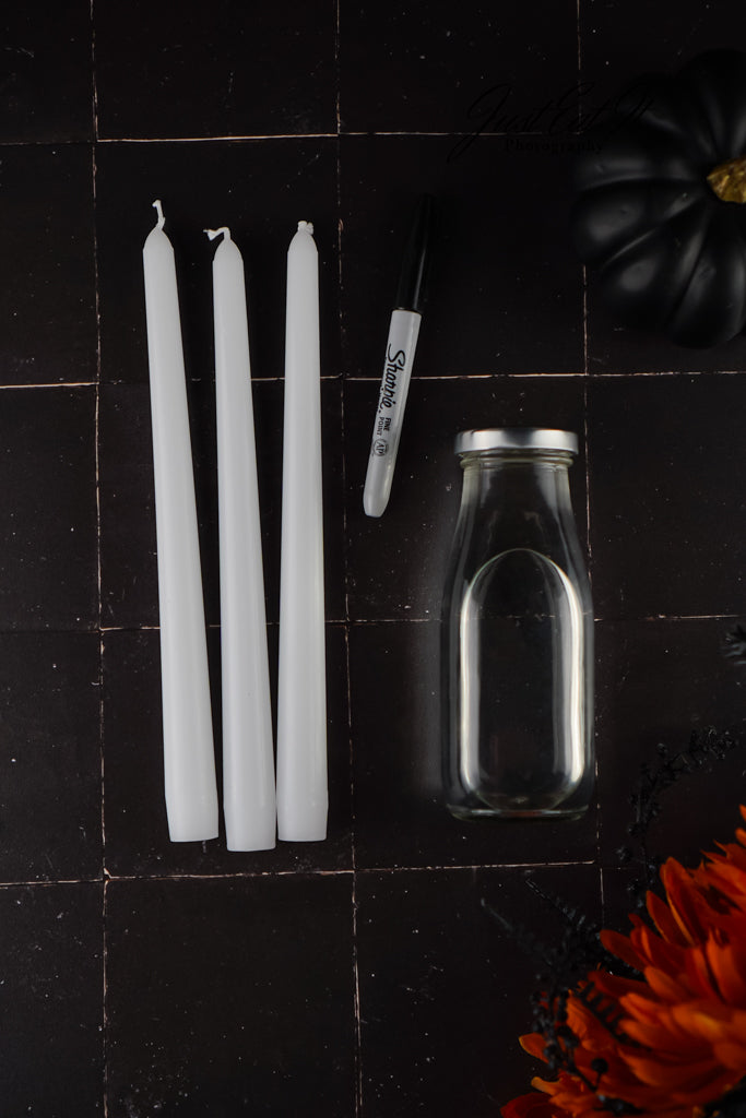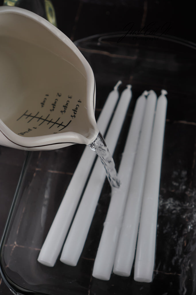 - Items Needed: tapered candles, water, glass dish, rubber gloves, and a black permanent marker.