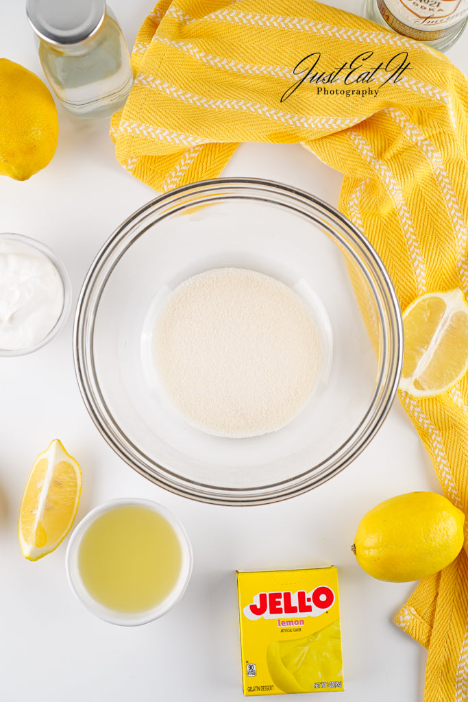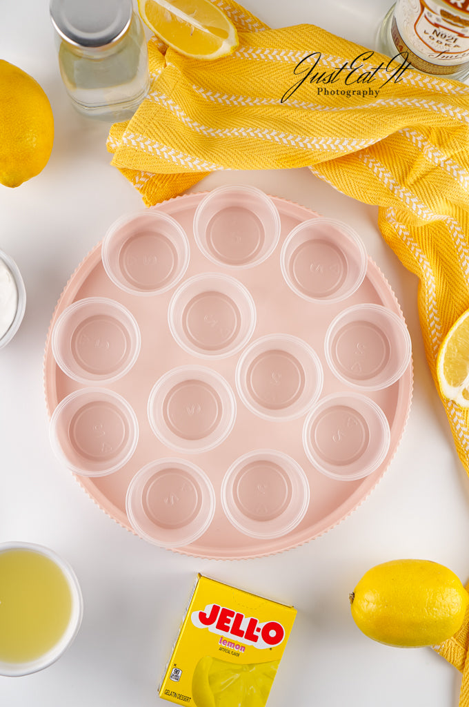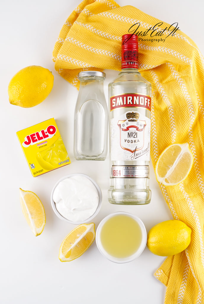 - Ingredients: lemon jello, vodka, lemon juice, water, whipped cream, and lemon wedges.