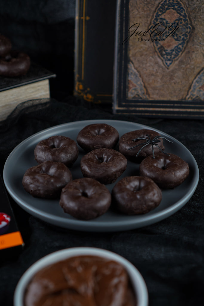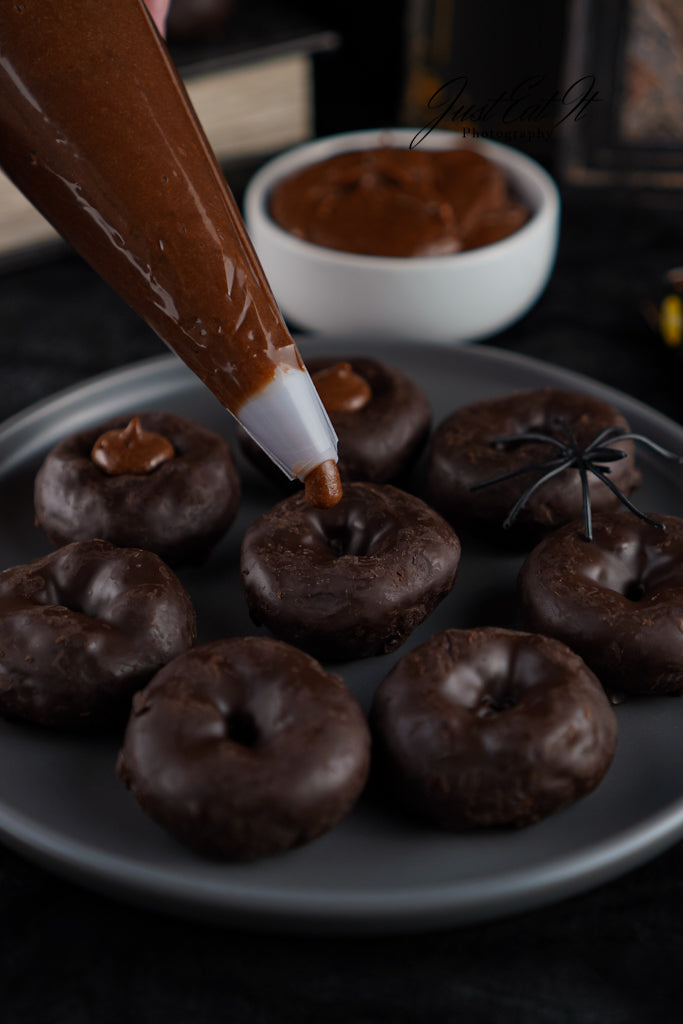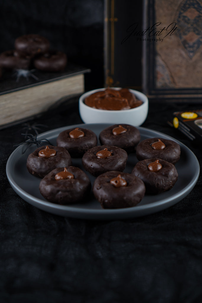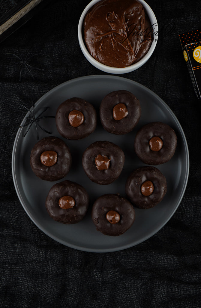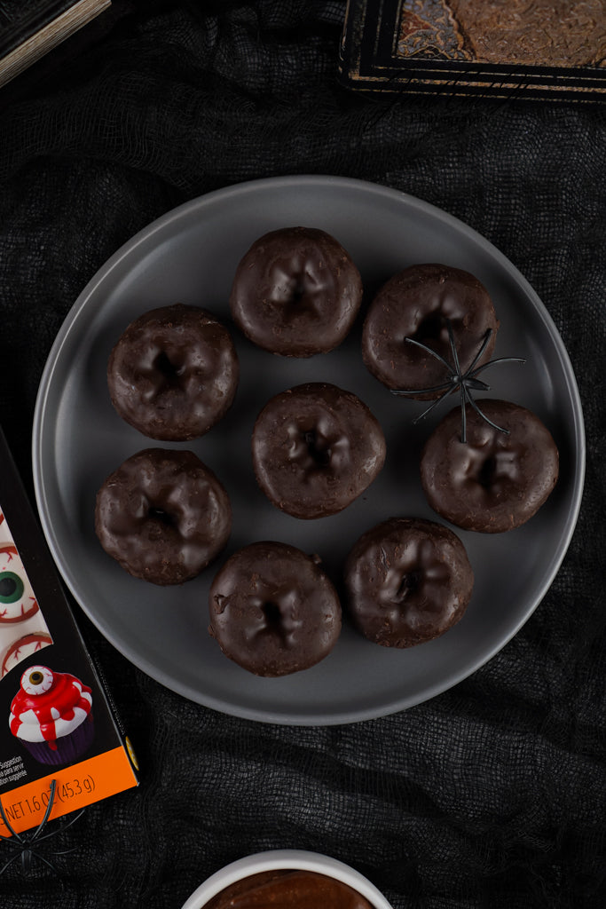 - Ingredients: chocolate mini donuts, candy eyes, and chocolate frosting.