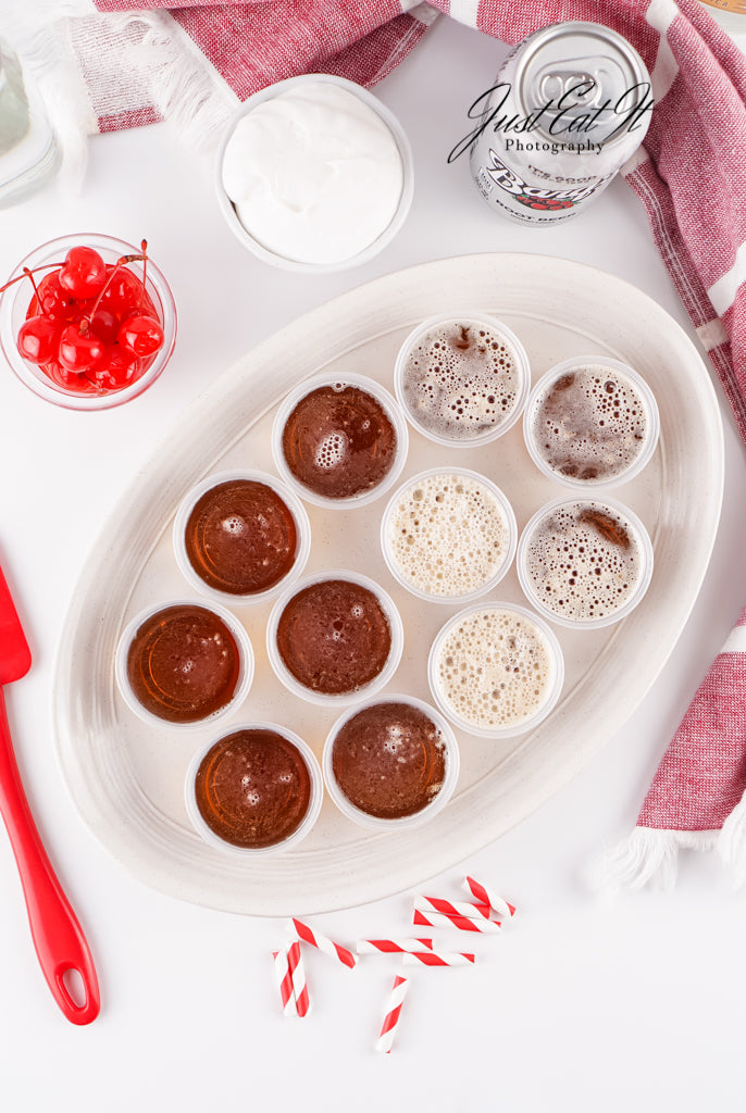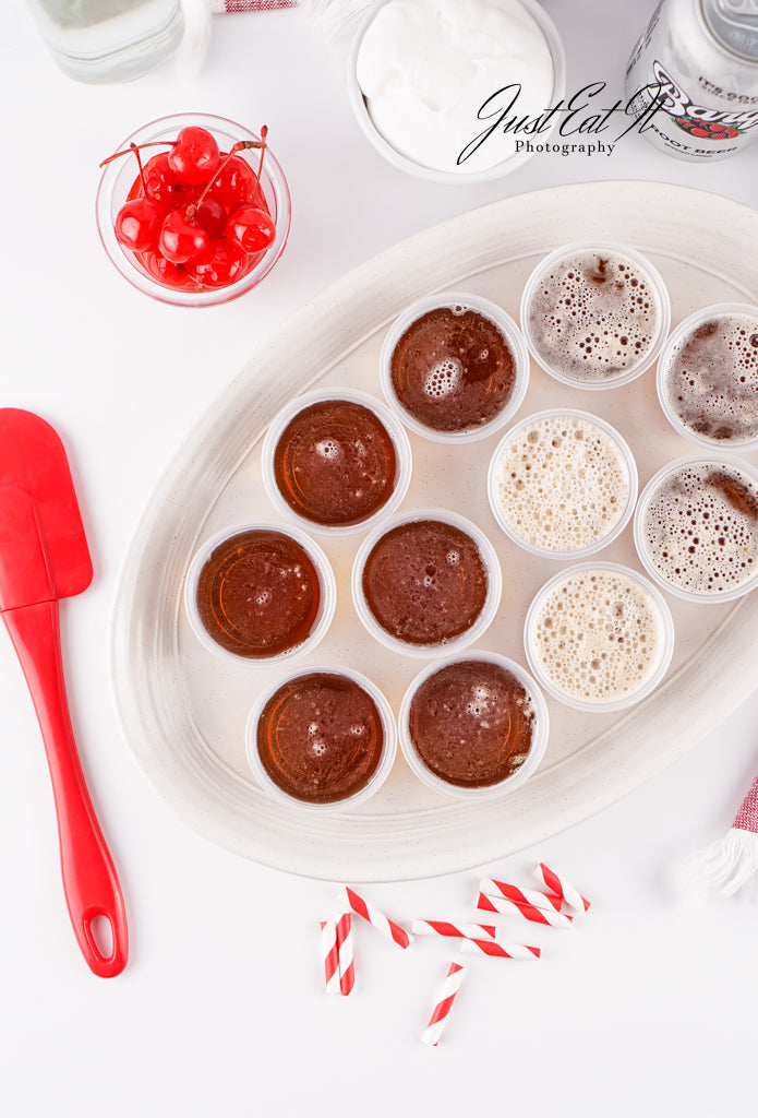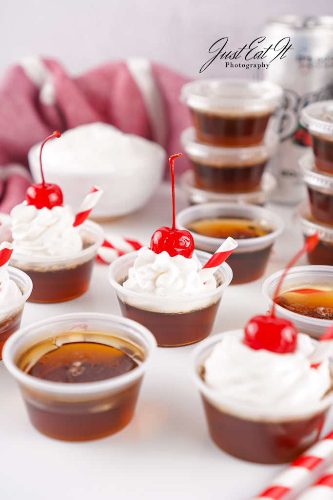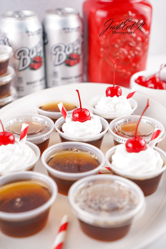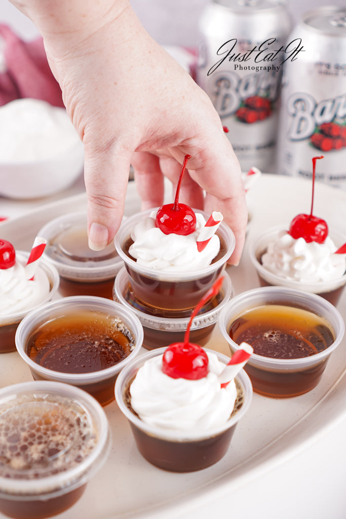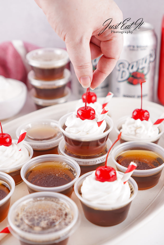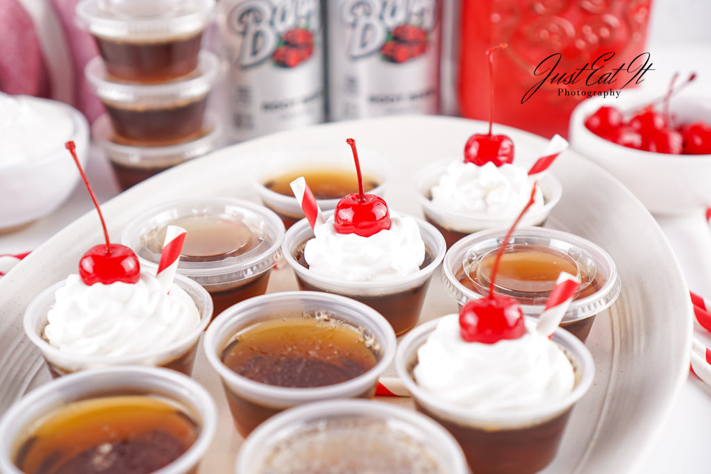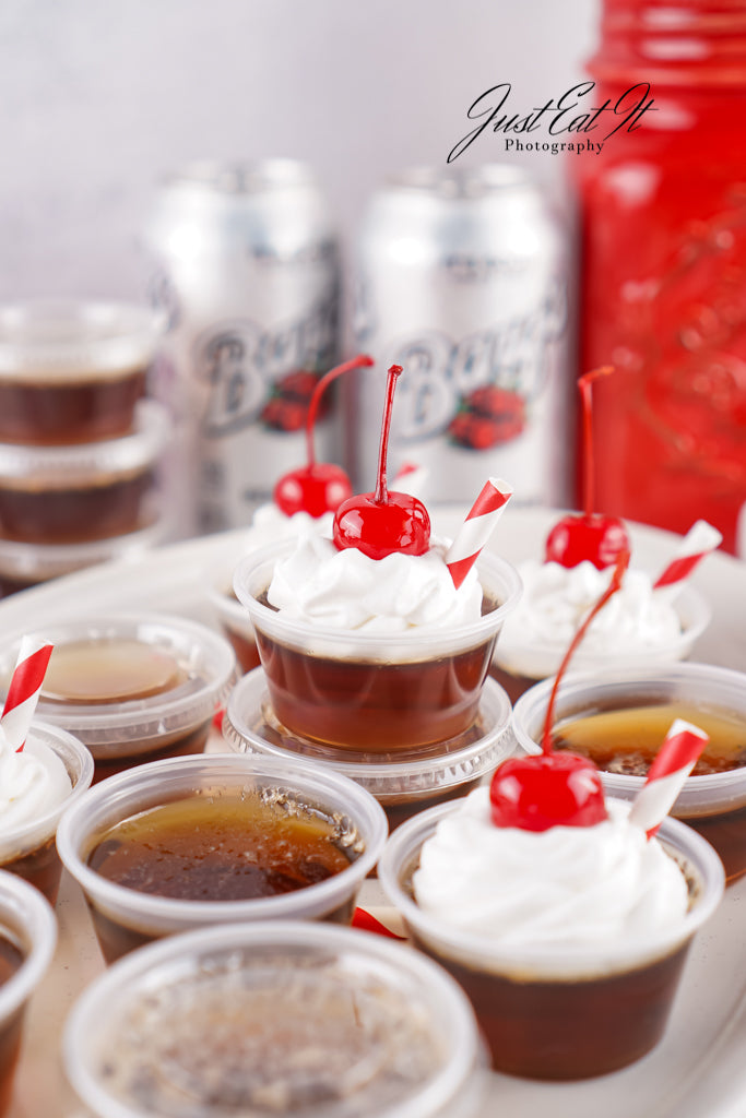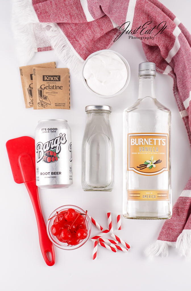 - Ingredients: unflavored gelatin, root beer, vanilla vodka, water, whipped cream, and maraschino cherries.