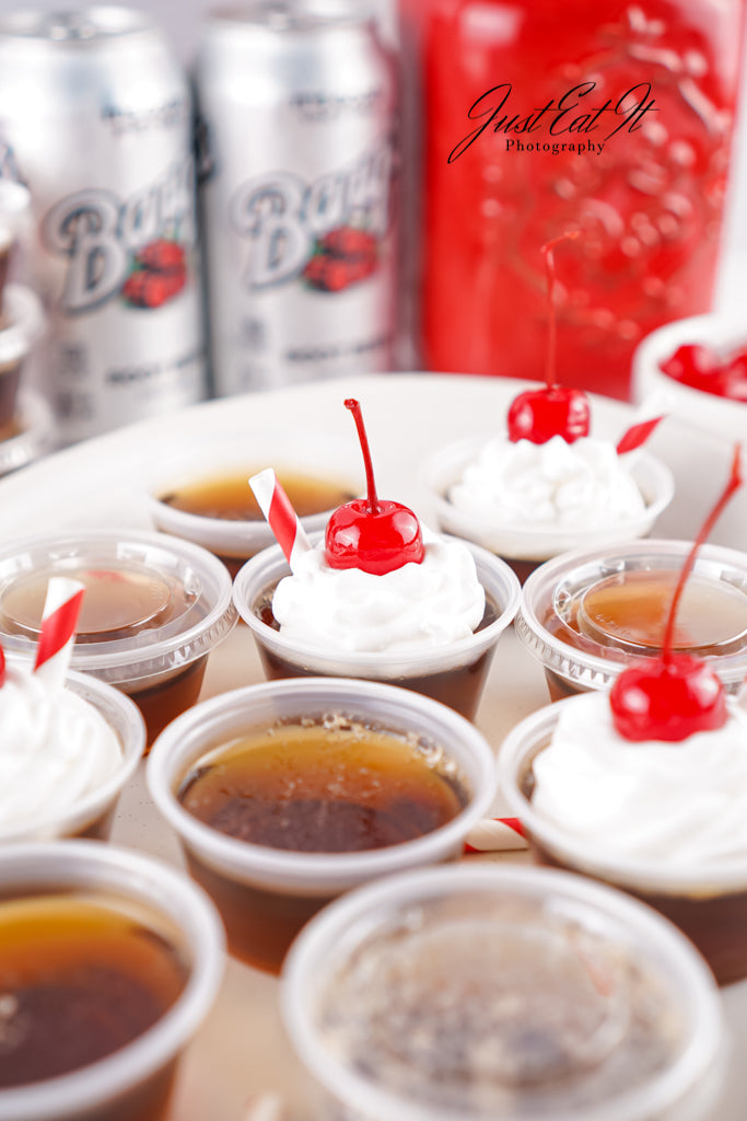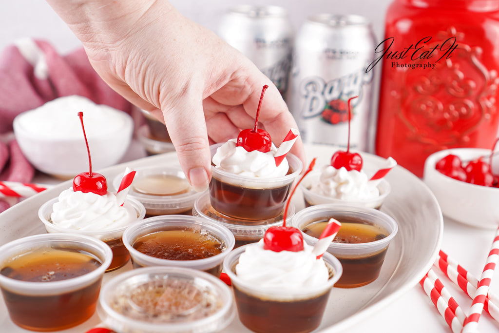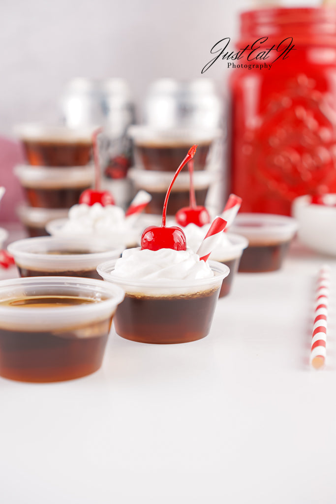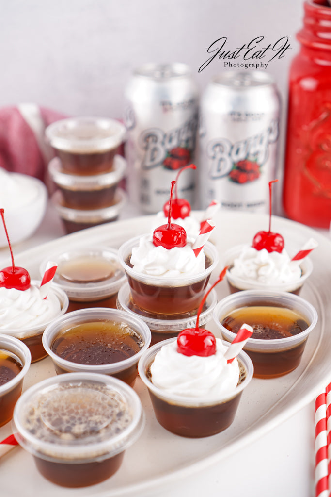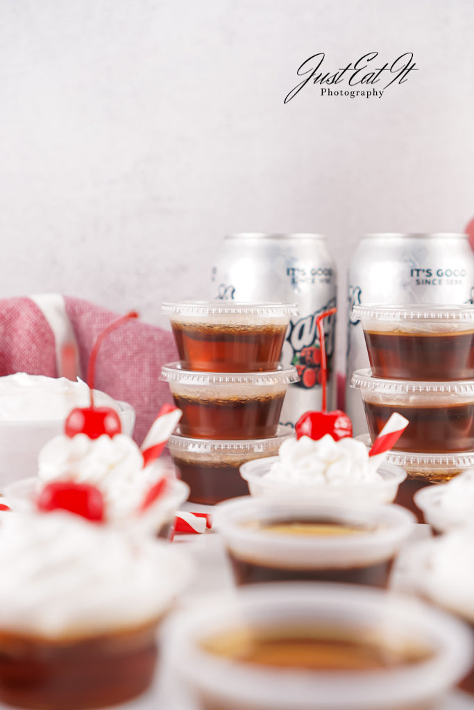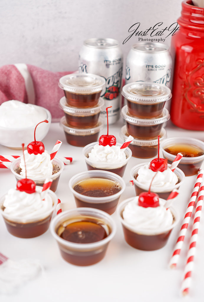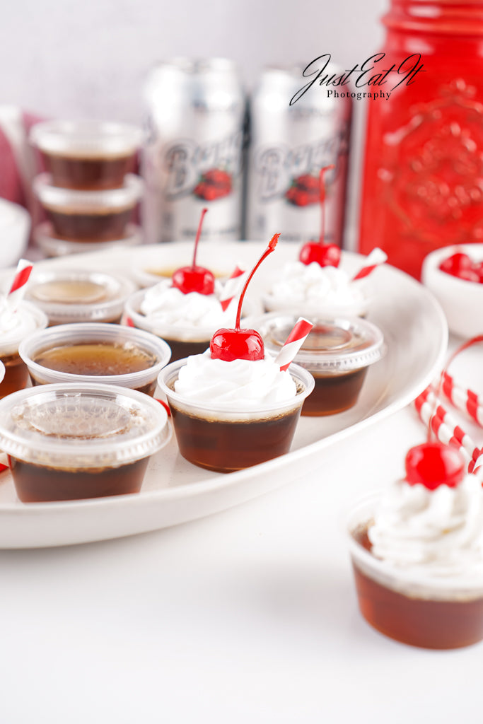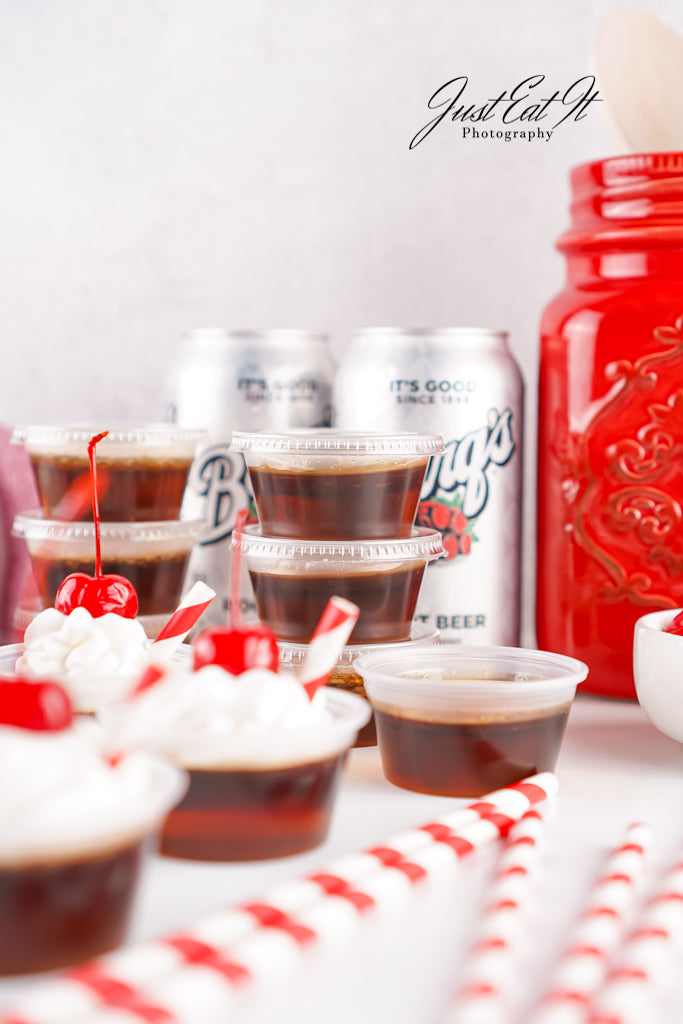 - Ingredients: unflavored gelatin, root beer, vanilla vodka, water, whipped cream, and maraschino cherries.