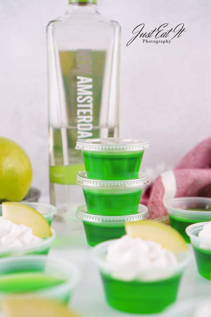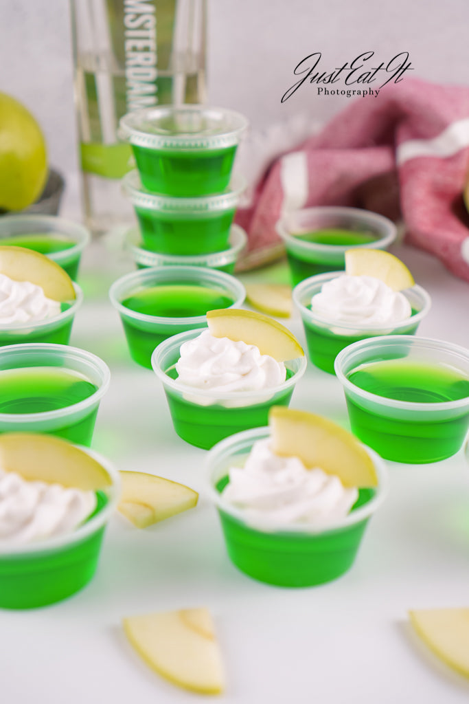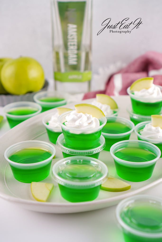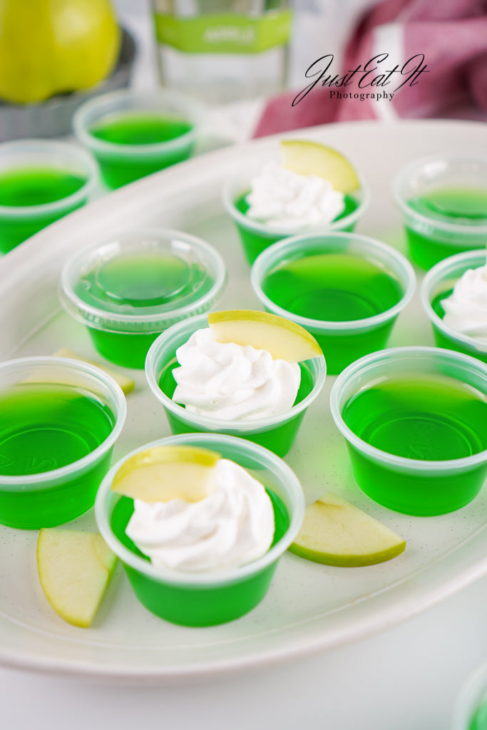 - Intro: Sour Green Apple Shots are for the adults who love a good kick in the mouth. Green apple jello and apple vodka carry all the flavor, while a bit of added citric acid kicks the sour up a notch. Super easy to make, and worth every minute.