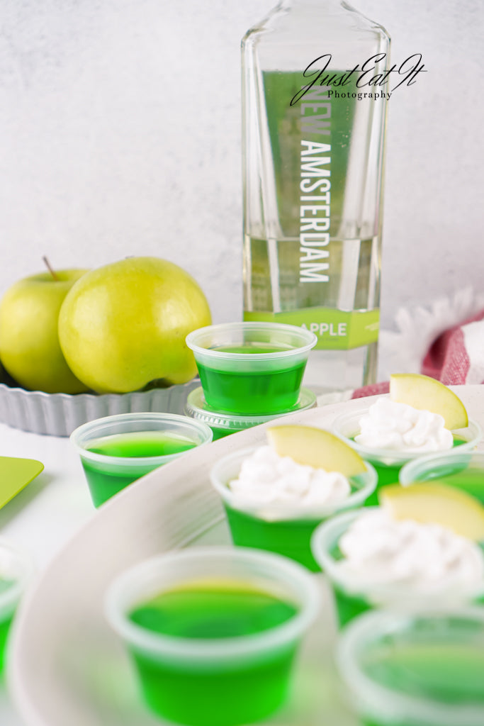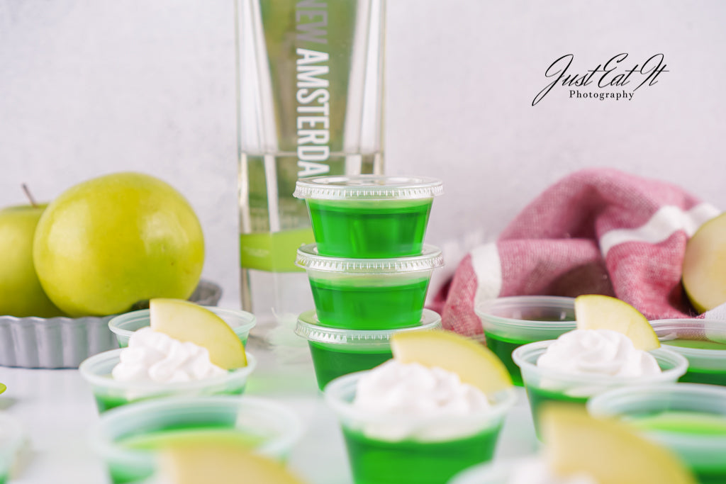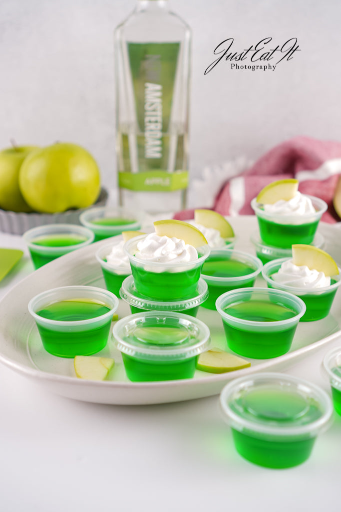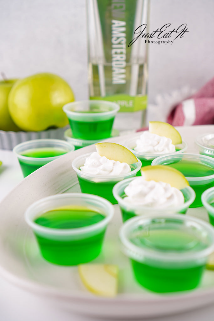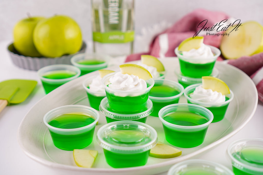 - Intro: Sour Green Apple Shots are for the adults who love a good kick in the mouth. Green apple jello and apple vodka carry all the flavor, while a bit of added citric acid kicks the sour up a notch. Super easy to make, and worth every minute.