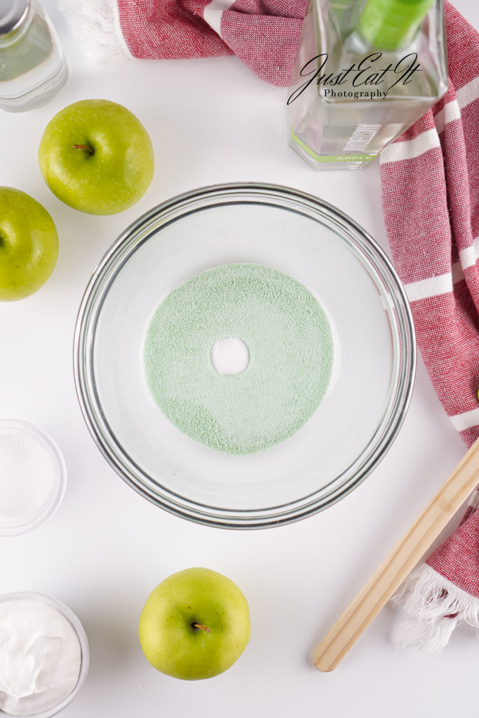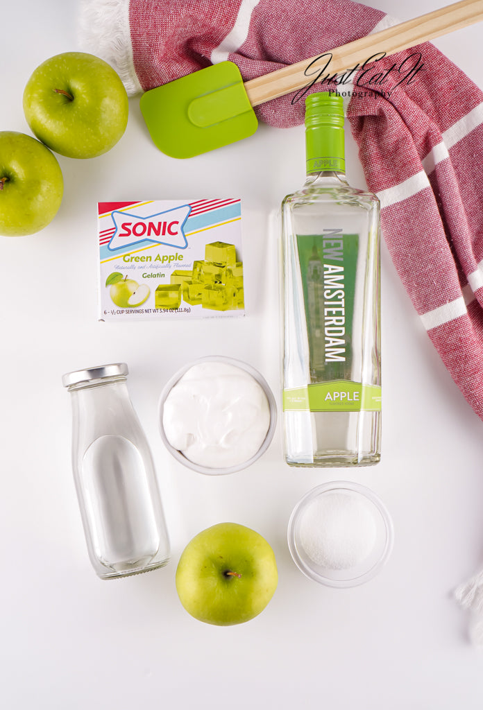 - Ingredients: sonic green apple jello, apple vodka, water, citric acid, whipped cream, and green apple slices.