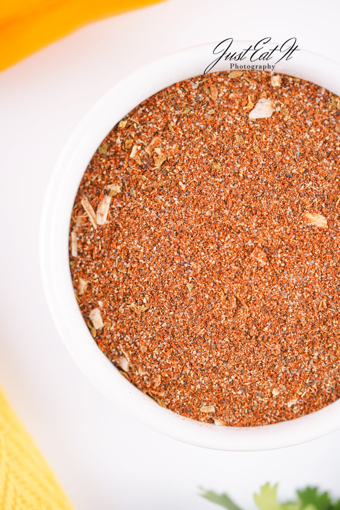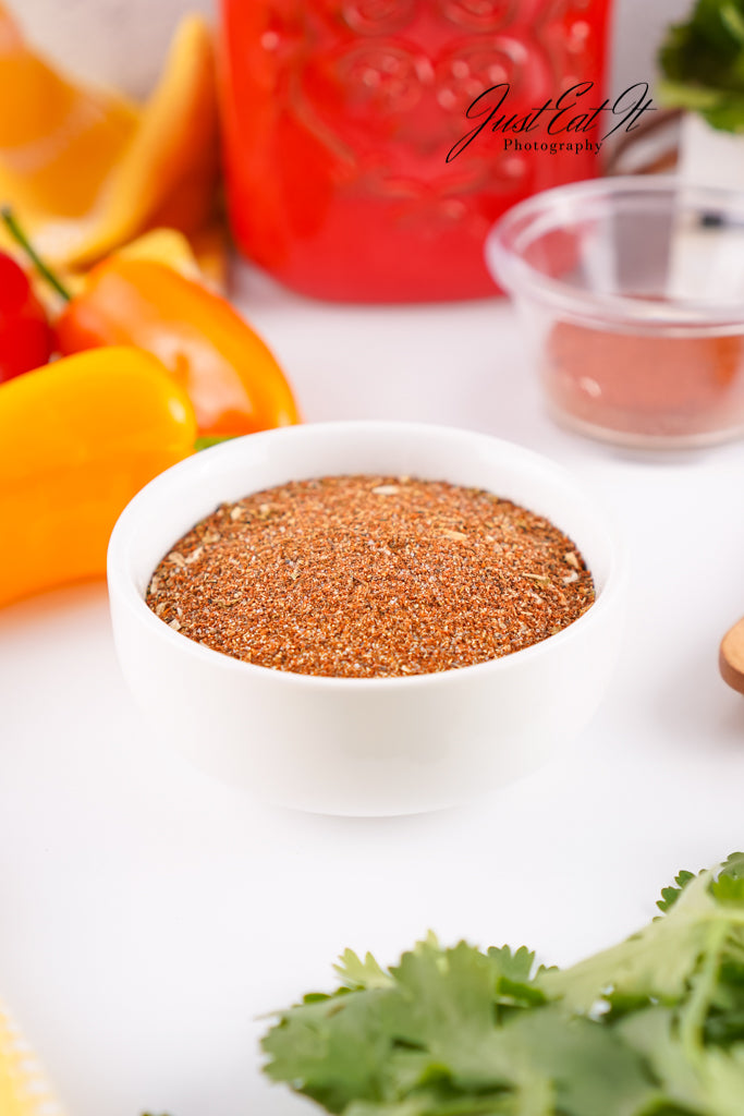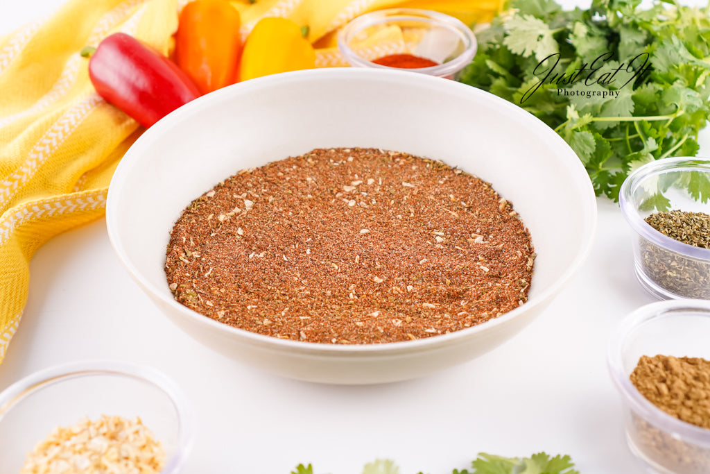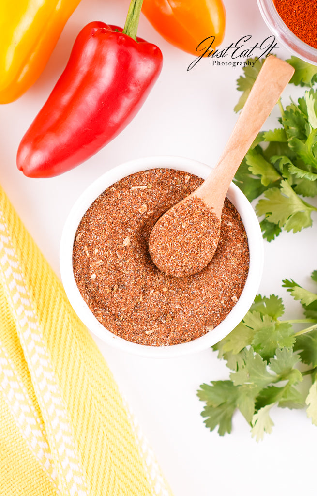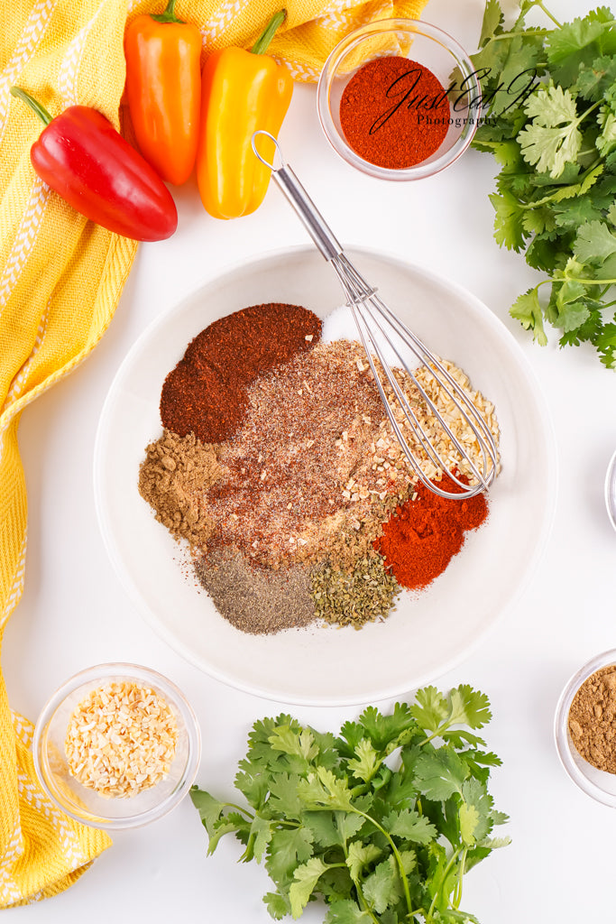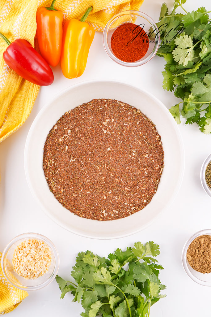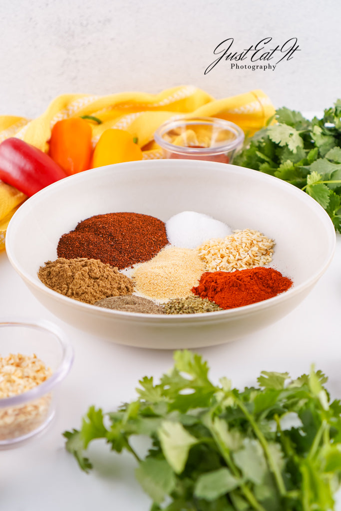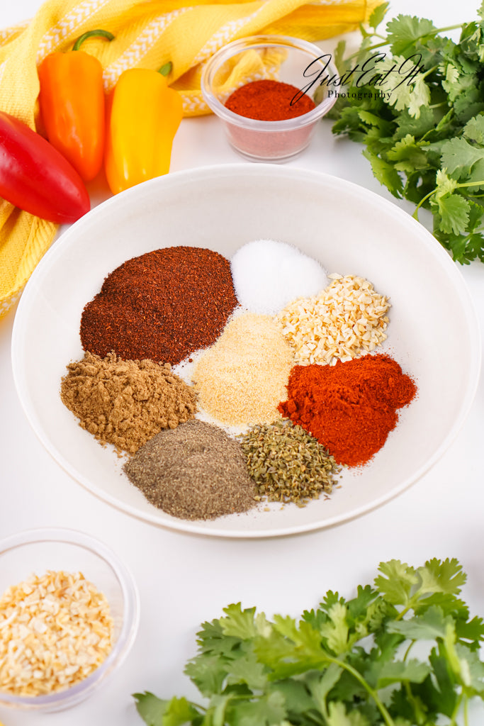 - Ingredients: chili powder, cumin, salt, pepper, smoked paprika, dried minced onion, garlic powder, and dried oregano.