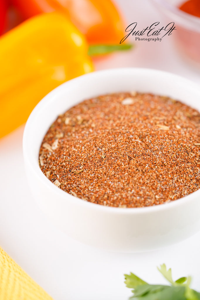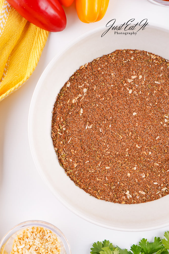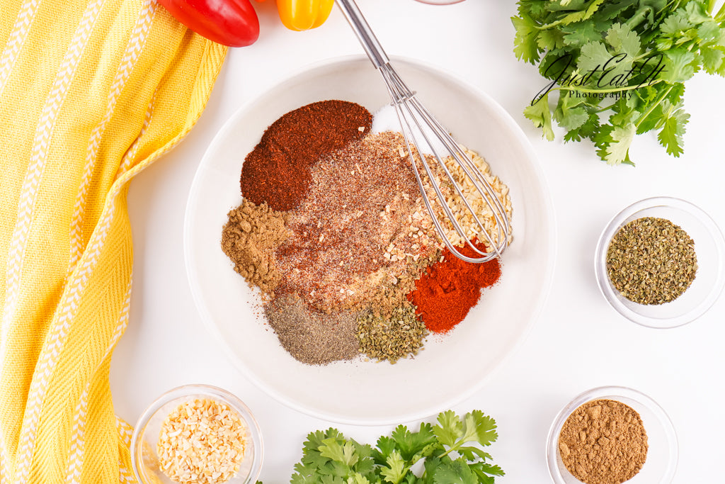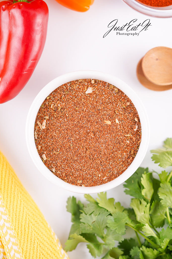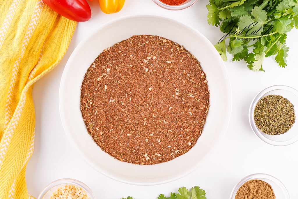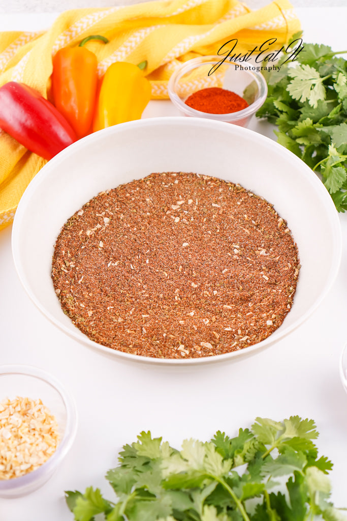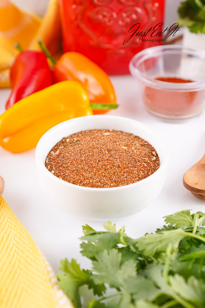 - Ingredients: chili powder, cumin, salt, pepper, smoked paprika, dried minced onion, garlic powder, and dried oregano.