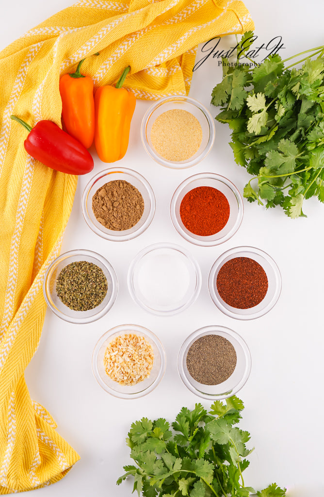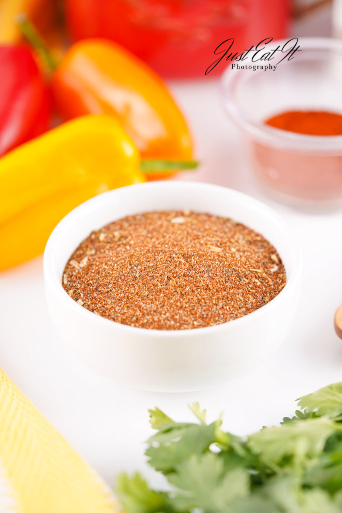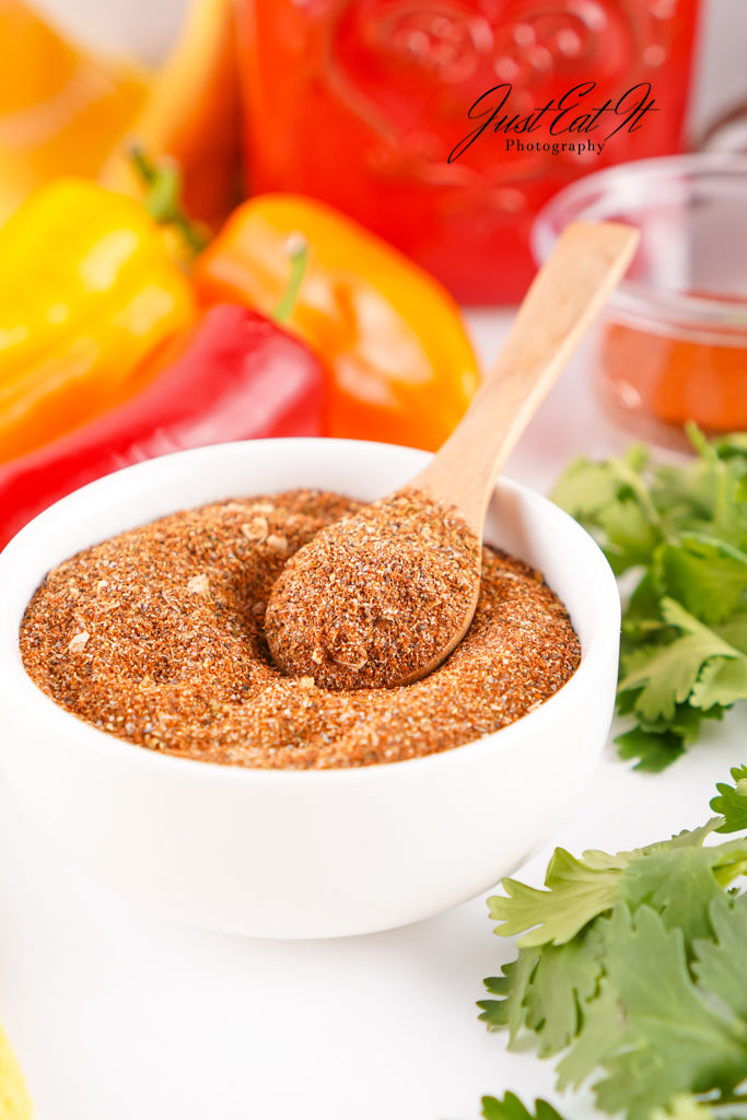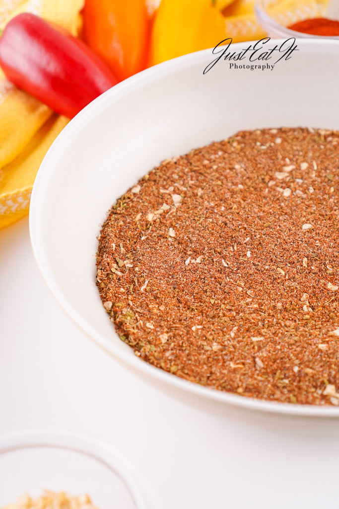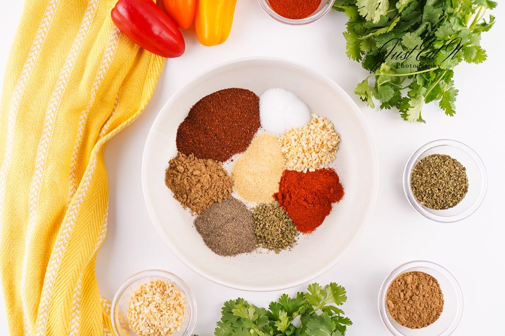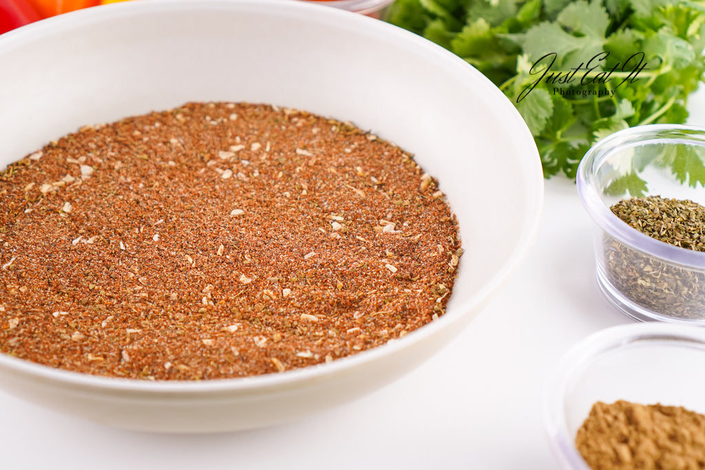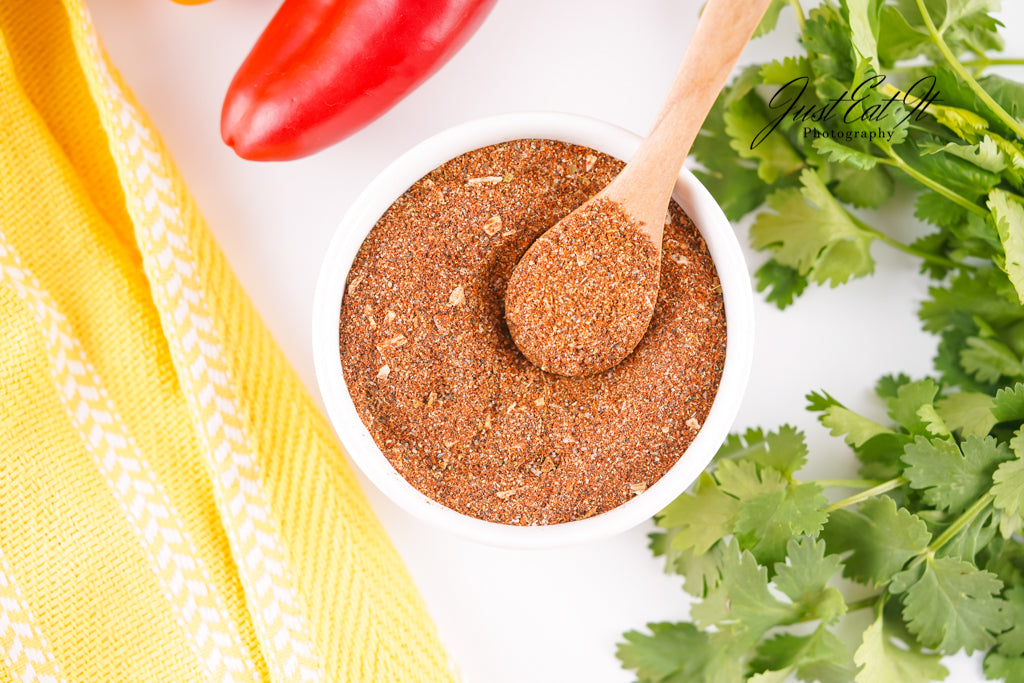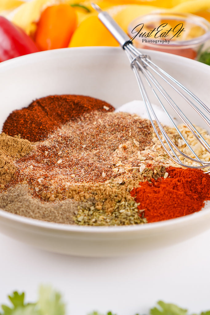 - Ingredients: chili powder, cumin, salt, pepper, smoked paprika, dried minced onion, garlic powder, and dried oregano.
