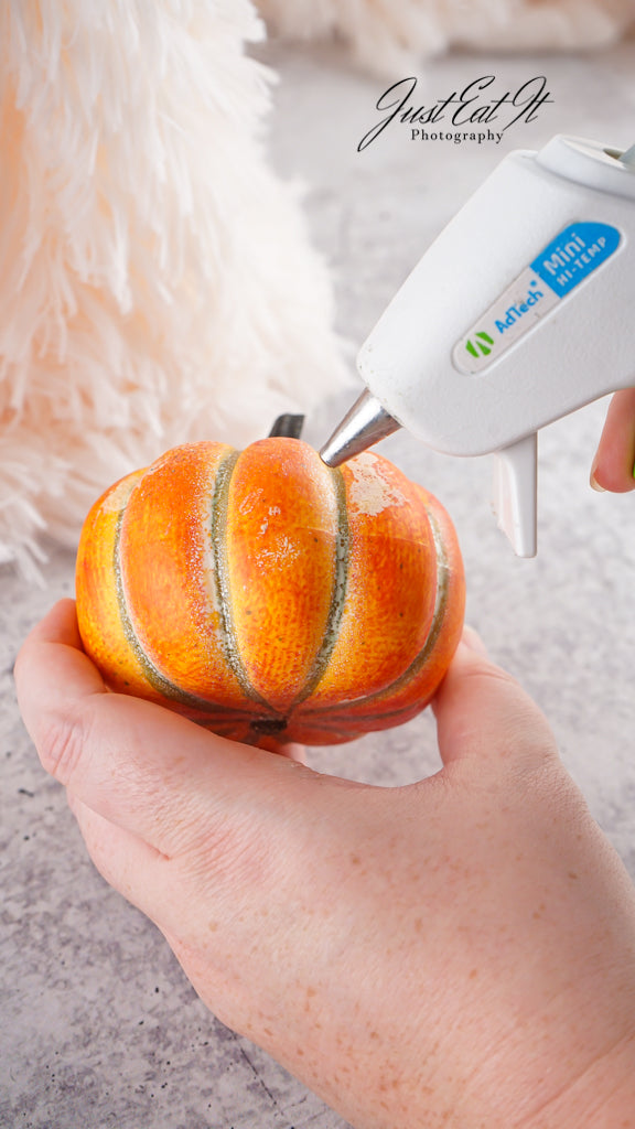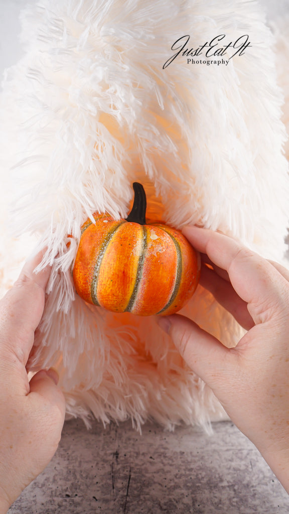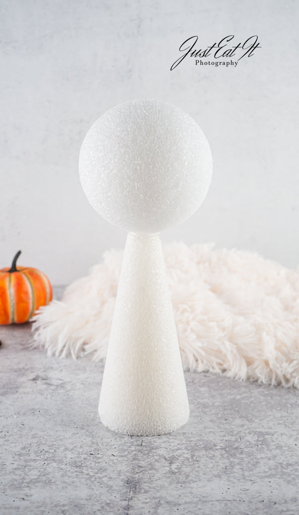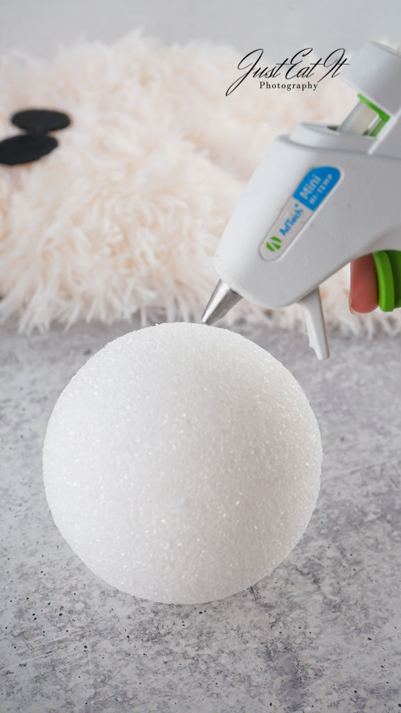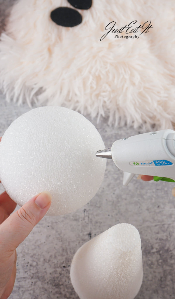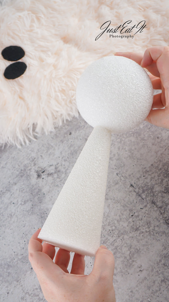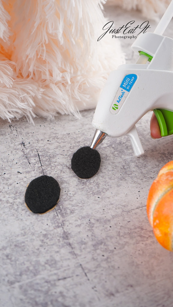 - Items Needed List: sherpa material, black felt ovals, styrofoam cone, styrofoam ball, small fake pumpkin, hot glue gun, and glue sticks.