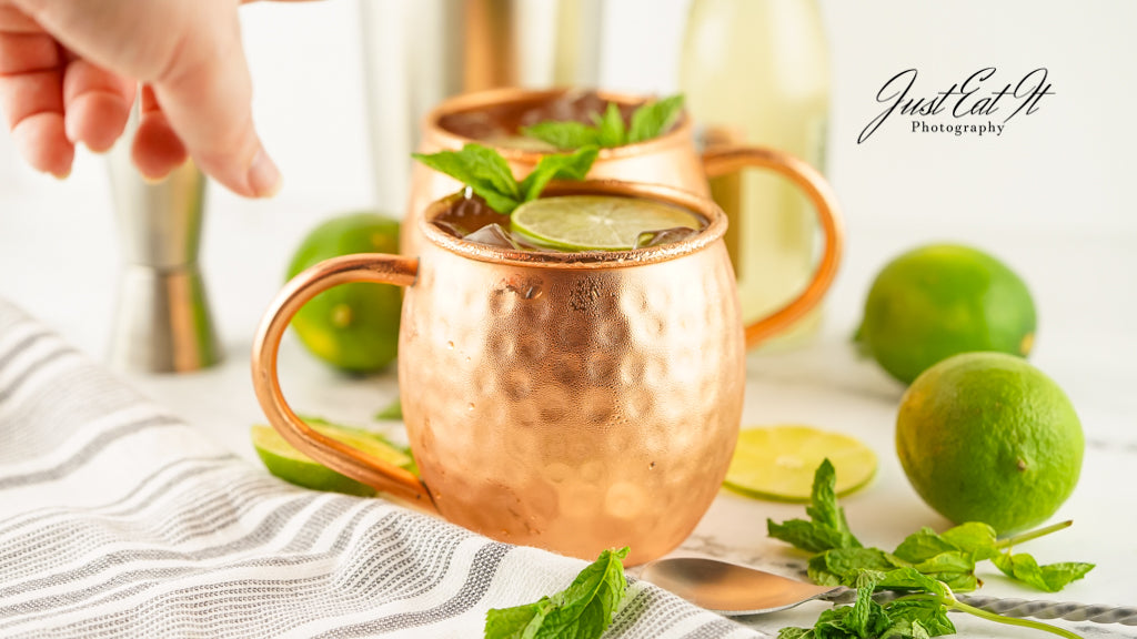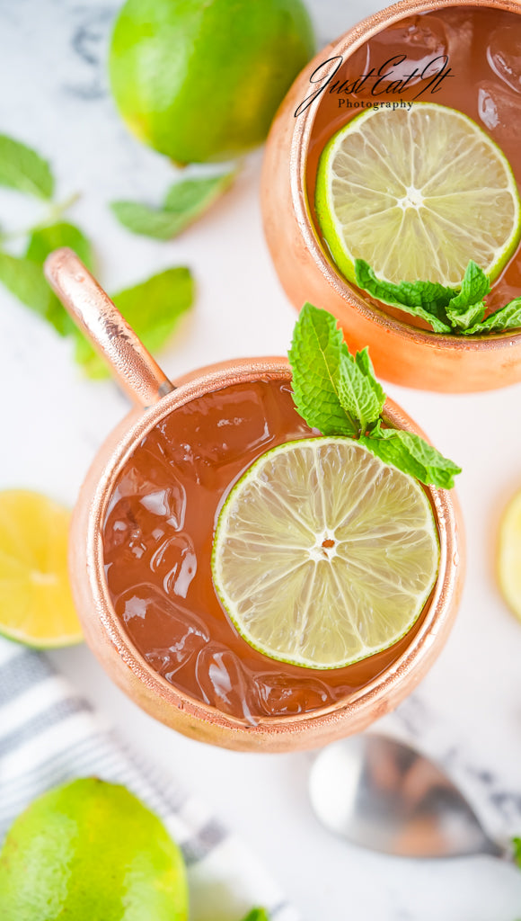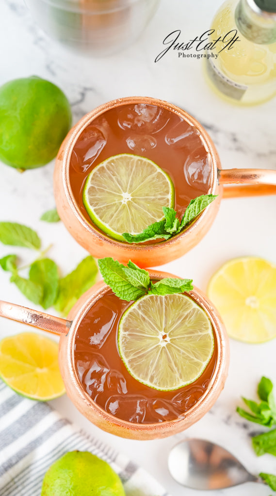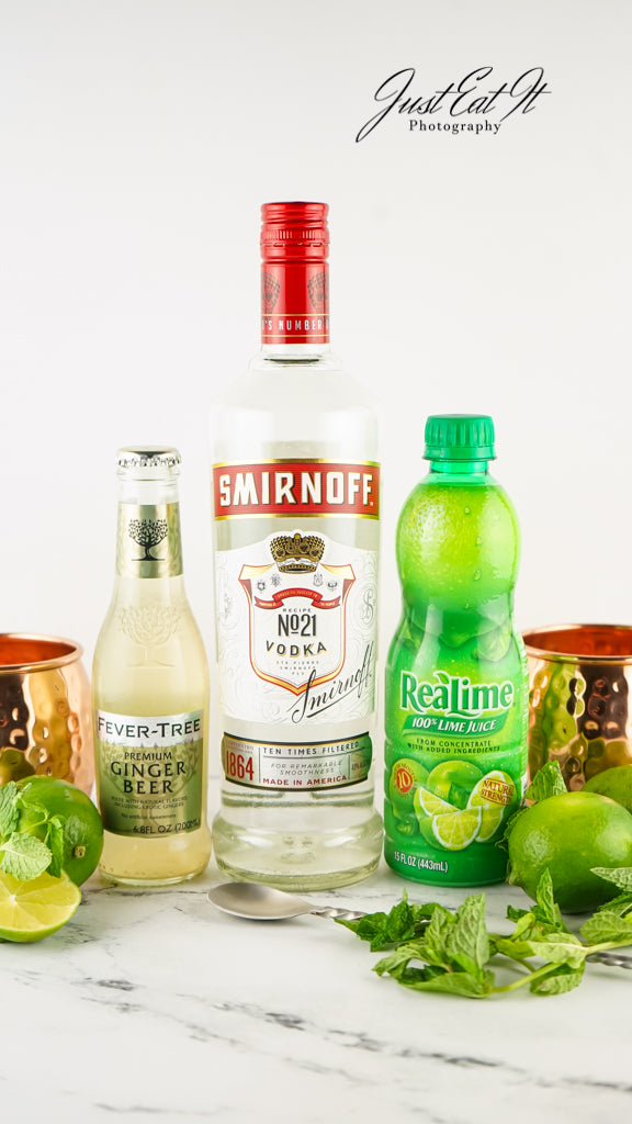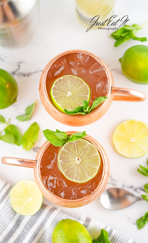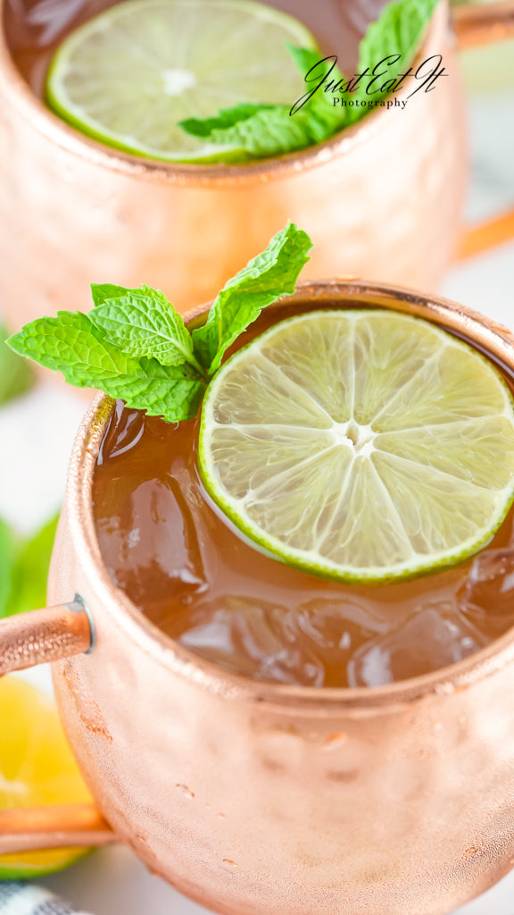 - Ingredients include ginger beer, ice, vodka, and lime juice with lime slices and mint sprigs as optional garnishes.