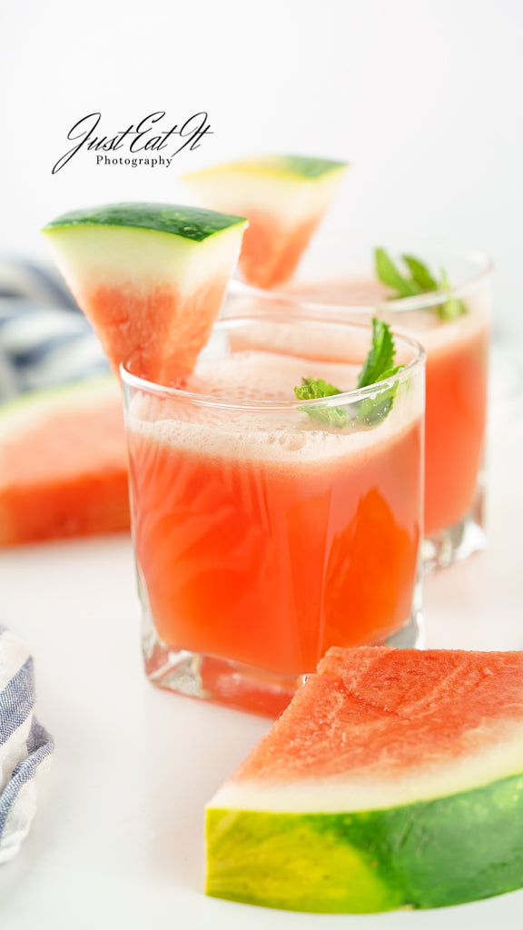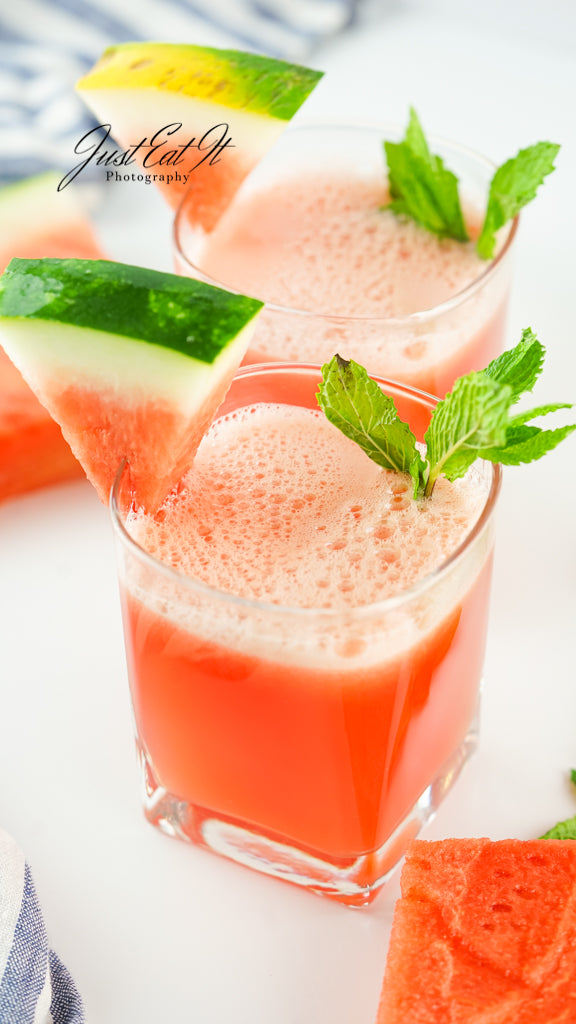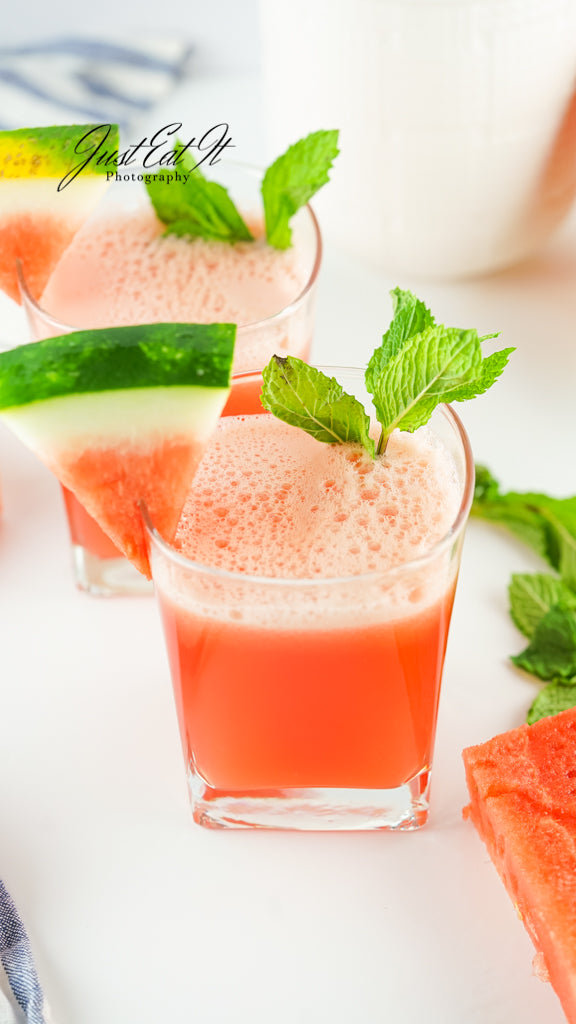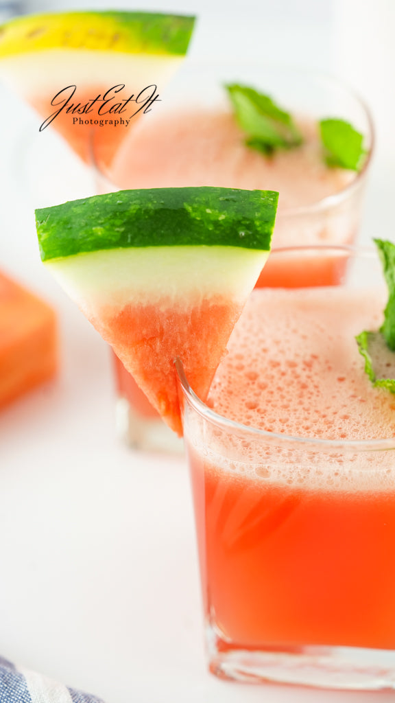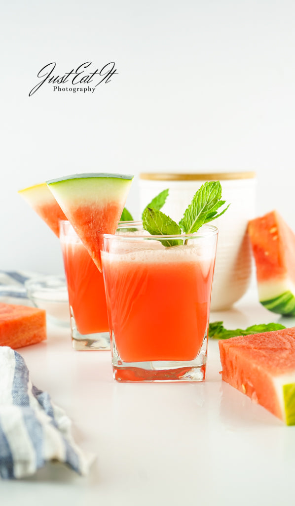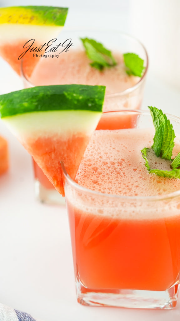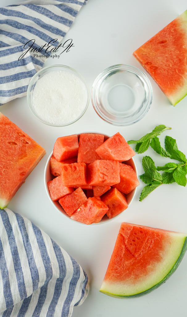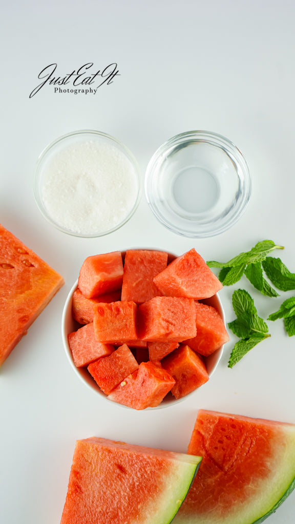 - Ingredients include watermelon, water, and sugar, with mint sprigs and extra small wedges of watermelon as optional garnishes.