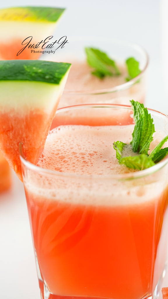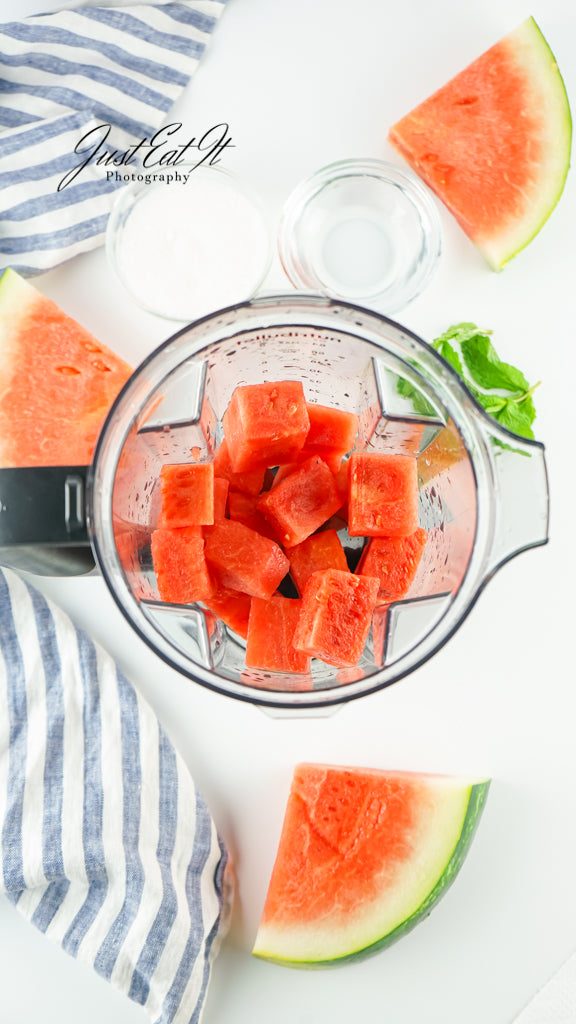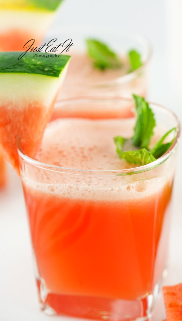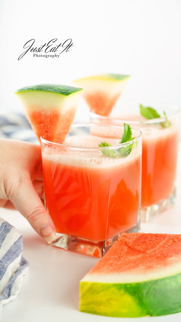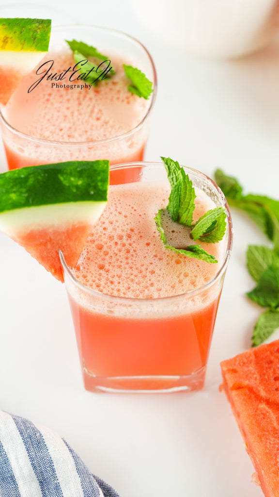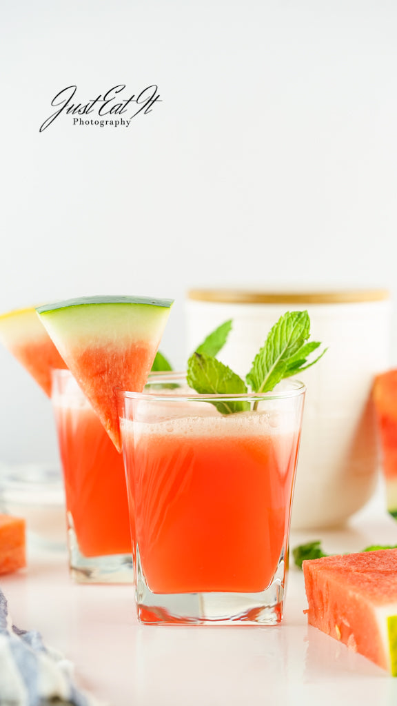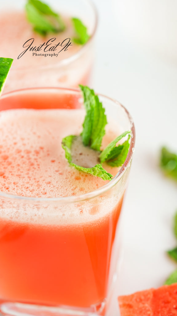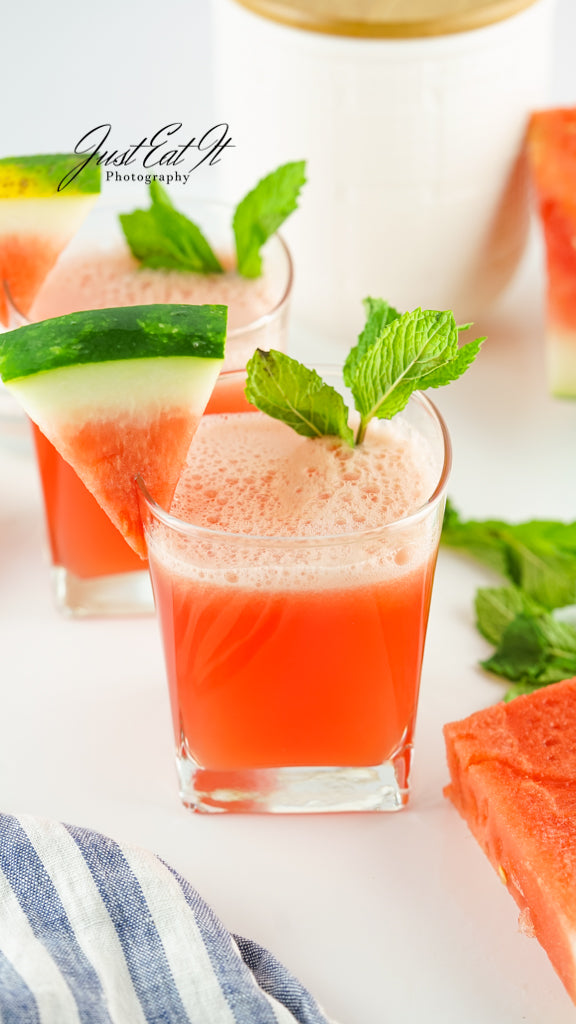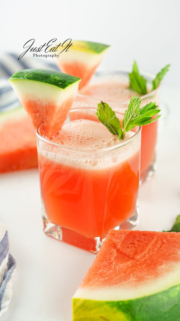 - Ingredients include watermelon, water, and sugar, with mint sprigs and extra small wedges of watermelon as optional garnishes.